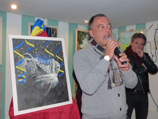 [Img #66742]Llegando a su recta final, se ha procedido al descubrimiento del cartel anunciador de la XVI Erizá Popular por parte del autor y de la delegada de Fiestas. Un camaleón dibujado a lápiz adornado por serpentinas con los colores del club cadista. Manolo Ruiz-Mateos ha agradecido a la peña la confianza puesta en él para este encargo cuyo resultado espera que sea del agrado del público. Su camaleón anuncia  la erizá el próximo 19 de febrero, una cita que el presidente de la peña, Antonio Rivero, espera compartir con todos los roteños y turistas propiciando una jornada de buen ambiente y Carnaval. No obstante, será el primer acto que caliente motores previo a la celebración oficial de esta fiesta que comenzará el 25 de febrero.