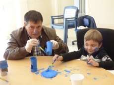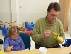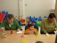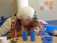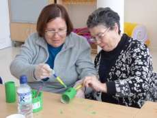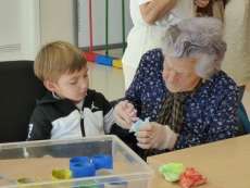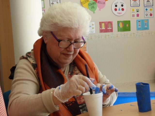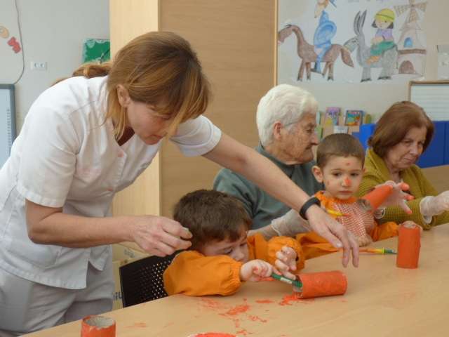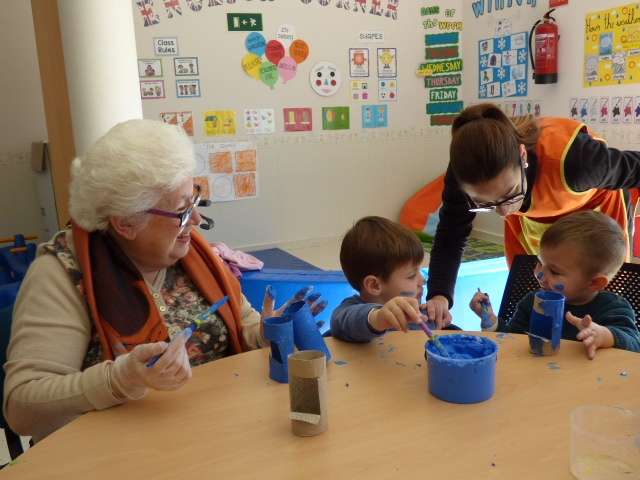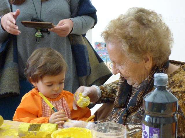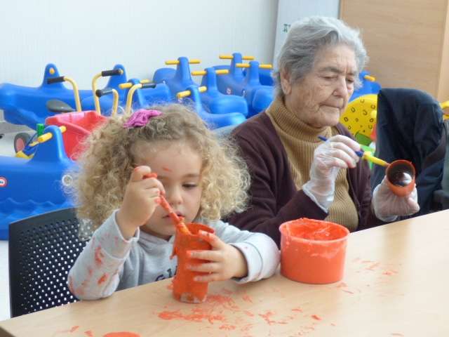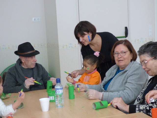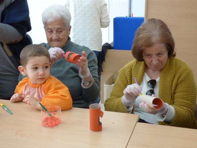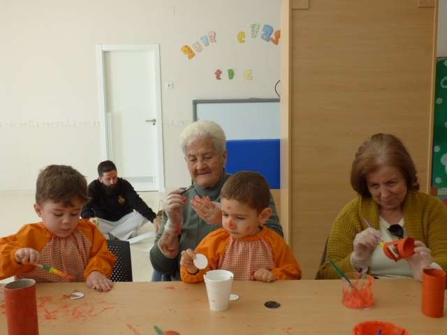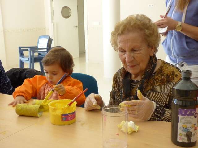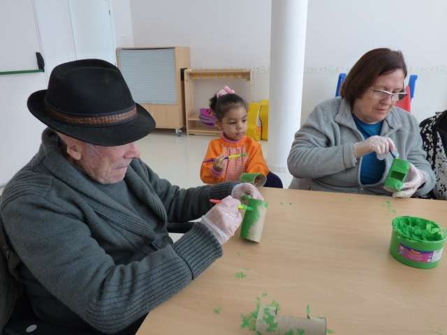 Con rollos de papel y pintura, los mayores del centro de alzheimer y los pequeños de la escuela "Laguna del Moral" han trabajado de forma conjunta para construir pequeños cochecitos guiados por las monitoras de ambos centros que están encantadas con la experiencia que genera este intercambio para las dos partes; el de trabajar codo con codo y el del valor de las cosas, ya que aunque no fueran exactamente así, muchos de los usuarios del centro de alzheimer tuvieron cuando eran niños juguetes de cartón.