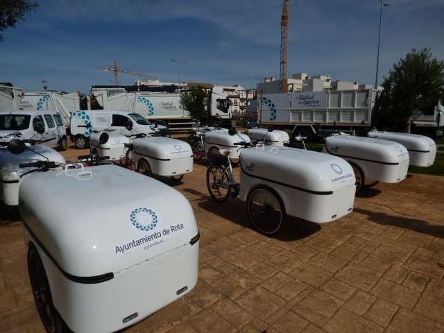 Concretamente, se han incorporado para el servicio de barrido, 18 triciclos eléctricos porta cubos incluyendo cada carrito soplador, corta hierbas, cubo y utensilios de barrido. Para el servicio de recogida de residuos, la incorporación es de 3 camiones compactador de carga superior de 20m3 para recogida de basura soterrada, un camión compactador de recogida de carga trasera de 19m3, un camión de caja abierta con grúa para contenedores soterrados, un vehículo porter eléctrico con caja basculante, además de dos furgonetas eléctricas de inspección para uso de los encargados. Un nuevo parque móvil, cuya inversión está valorada en unos 3,5 millones de euros, que responde a las mejoras que se recogían en el convenio definitivo que el Ayuntamiento firmó con FCC el pasado 3 de mayo de 2016 con vigencia para los próximos 15 años y que permitirán que Rota utilice para sus labores de limpieza viaria y recogida de basuras vehículos sostenibles y nuevas tecnologías algunas de las cuales son pioneras en Andalucía e incluso en España.