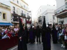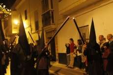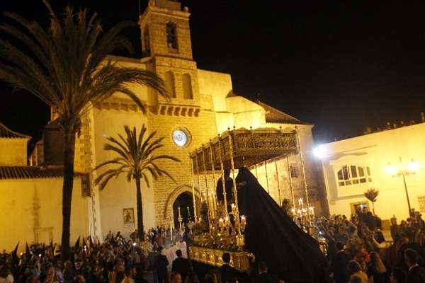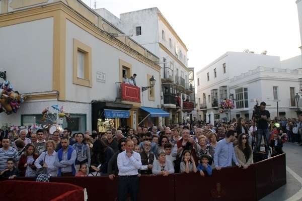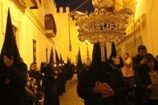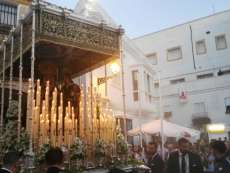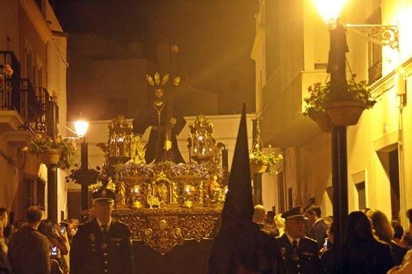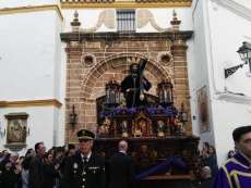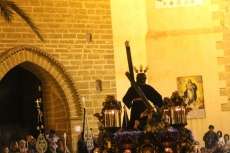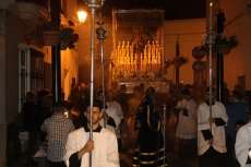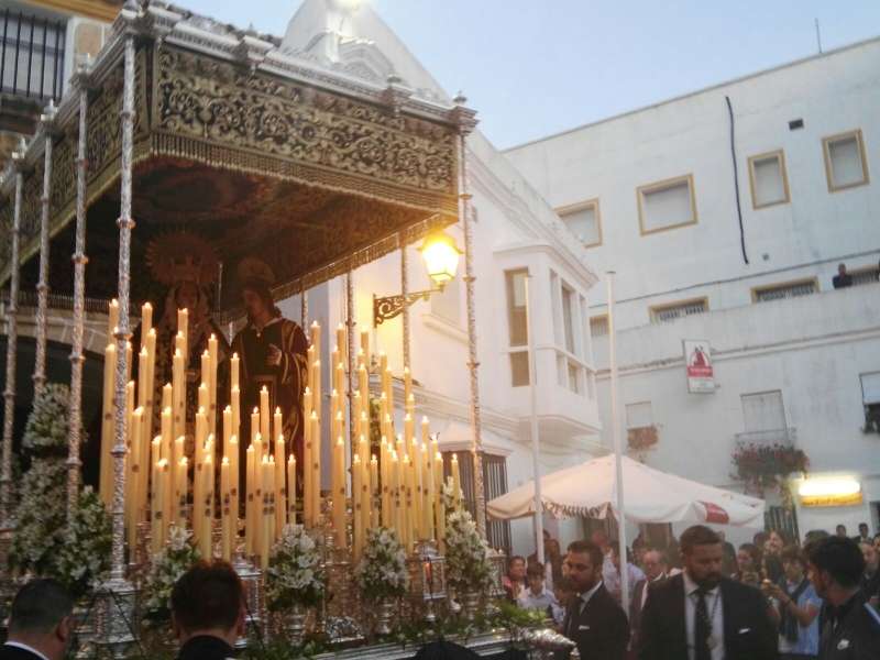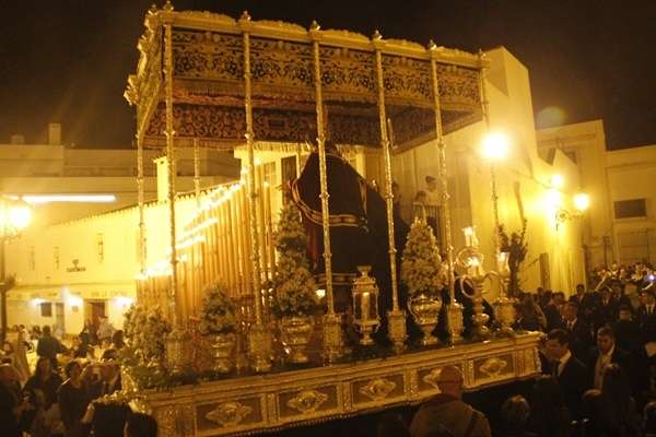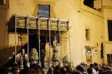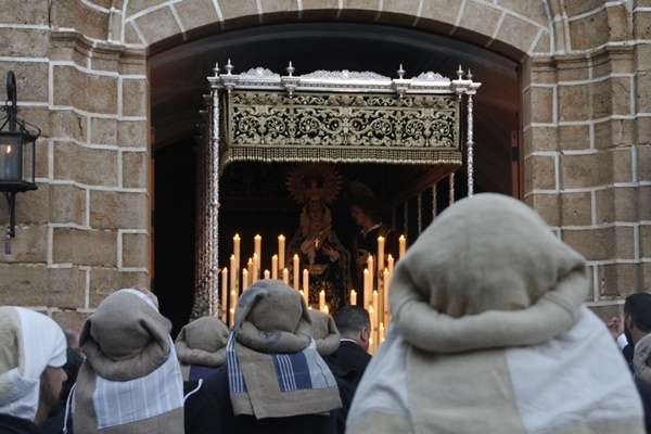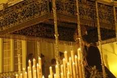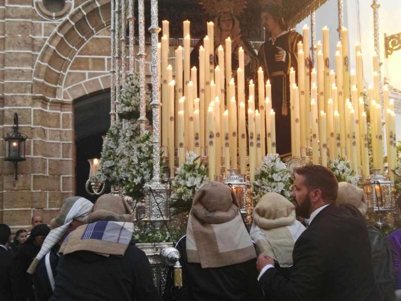 Si algo destaca en el inicio de esta procesión, es la dificultad que tienen los costaleros, tanto los que portan a Jesús como a la Virgen, para salir de capilla ya que las estrechas dimensiones de la puerta hacen dificultosa y muy trabajosa la labor de ambas cuadrillas que salen de rodillas hasta poder montar los bajos del paso al completo ya en la calle. Un empeño y pericia que siempre se salda con éxito y que el público agolpado en plaza de Andalucía reconoce con sendos aplausos.