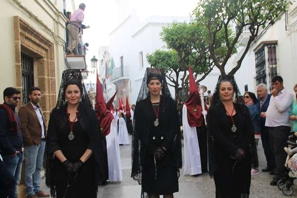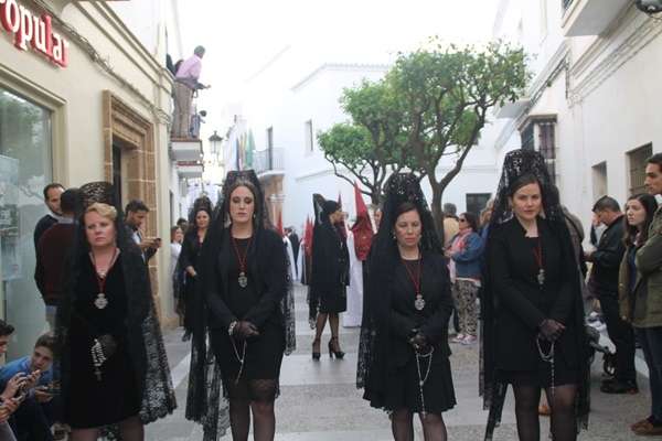 Durante el recorrido, unos 180 hermanos acompañaron a la Virgen de los Dolores y al Cristo de la Caridad, entre los que se encontraba una buena representación del Grupo Joven, savia nueva que va entrando en la cofradía desde hace algunos años, y mujeres de mantilla de riguroso negro.