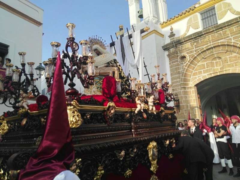 El Jueves Santo concluyó con la normalidad que se esperaba teniendo en cuenta que el tiempo acompañaba desde el principio y es día festivo, lo que ayudó a que hubiera mucho más ambiente acompañando a los titulares de la Hermandad de los Dolores que desde las siete y cuarto, partían de la capilla de la Caridad. Un entorno el de la plaza de Andalucía que estaba lleno de gente, cofrades y turistas, que se mezclaban para ver a la dolorosa al pie de la cruz con su hijo en el regazo.