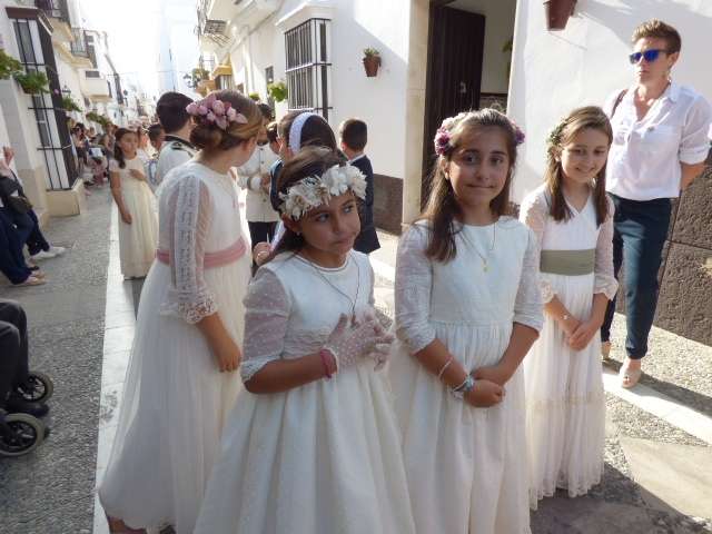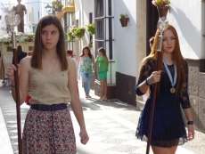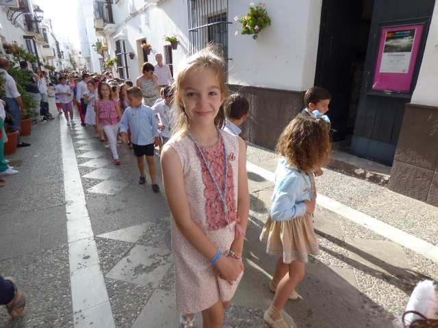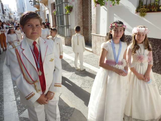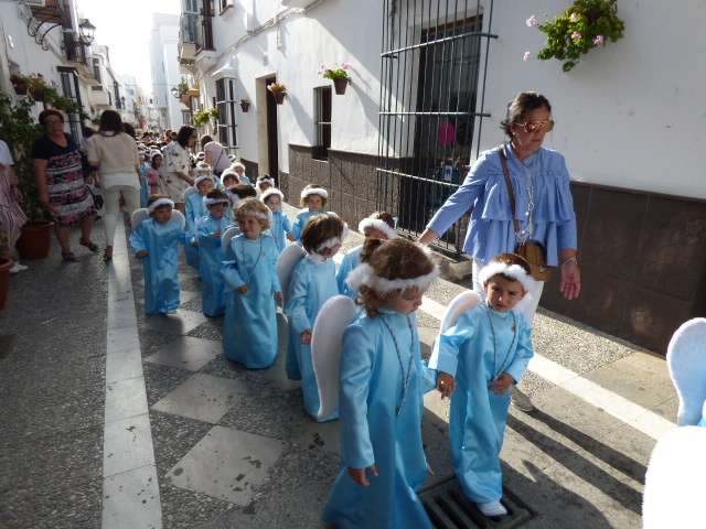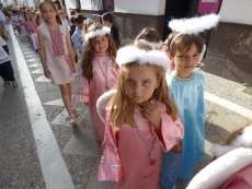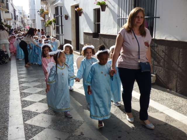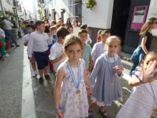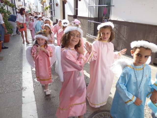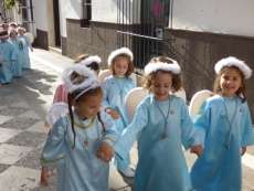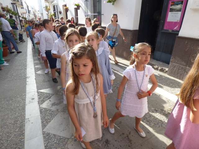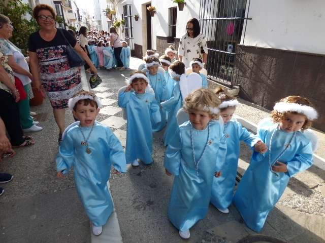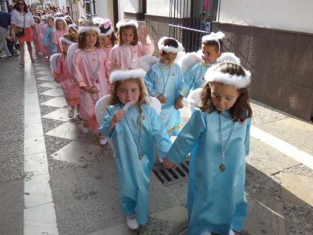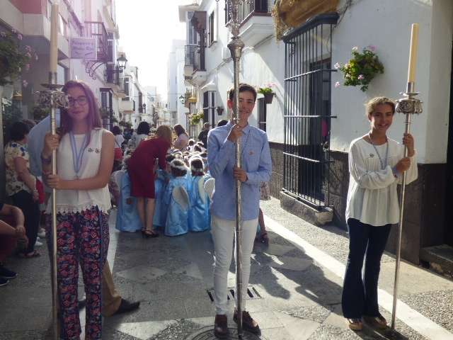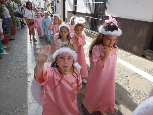 El colegio Nuestra Señora del Rosario se volcó un año más con María y también lo hicieron los roteños que salieron a ver esta procesión en una tarde bastante calurosa. Abría el cortejo un amplio grupo de niños de corta edad vestidos de angelitos, muy revoltosos como siempre, a los que guarda el orden les cuesta pero que dan un toque infantil entrañable. Le seguían más alumnos de Primaria vestidos de calle, aquellos que este año reciben su Primera Comunión, niñas muy pequeñas vestidas de mantilla, representantes del grupo scouts "Santo Domingo Savio", padres del AMPA, miembros de la directiva de los dos colegios salesianos de la localidad, así como otros representantes de la comunidad salesiana que ayer vivía un día de fiesta.