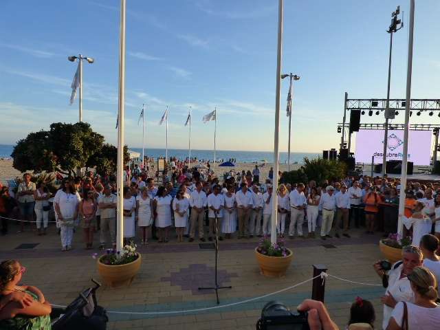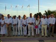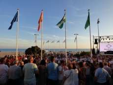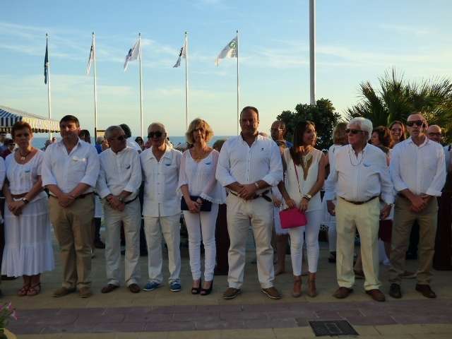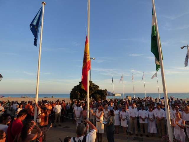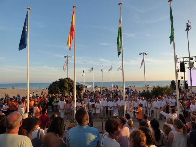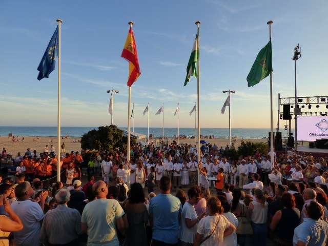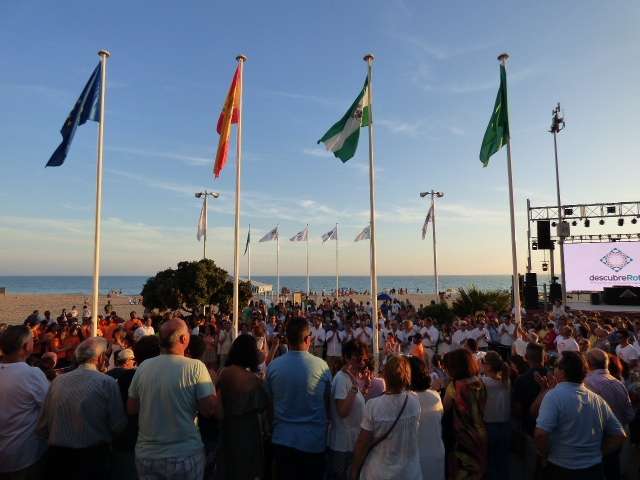 Entre baile de la batucada y flashmob flamenco, llegó el turno del acto más institucional de una tarde muy festiva. Fue a las nueve de la noche cuando toda la Corporación municipal, que respondió bien acudiendo vestida de blanco como se pedía también a la ciudadanía para dar mayor ambiente, formaba en el paseo marítimo para proceder a la izada de las banderas de Rota, Andalucía, España y Europa. Insignias que ondearán al igual que las certificaciones de calidad obtenidas en la costa, durante todo este verano 2017 que acaba de comenzar.
