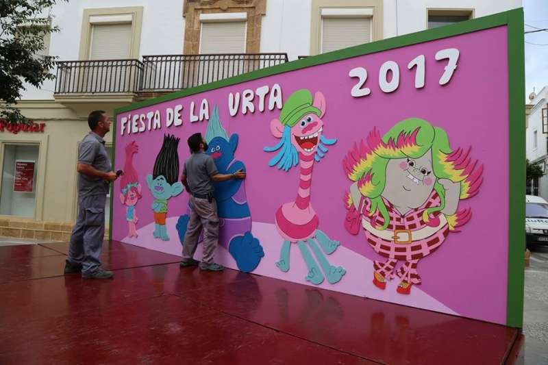 En la jornada de hoy ya se puede ver prácticamente terminada la instalación de la iluminación que con motivo de la Fiesta de la Urta se lucirá desde la avenida María Auxiliadora hasta la plaza Bartolomé Pérez, los motivos decorativos con personajes infantiles en la plaza de España, donde cada noche habrá una actuación para los niños, el escenario de la plaza Bartolomé Pérez donde las actuaciones estarán reservadas para un público más adulto o la decoración en la plaza de San Roque donde mañana ueves 3 de agosto se inaugurará la fiesta veraniega por antonomasia.