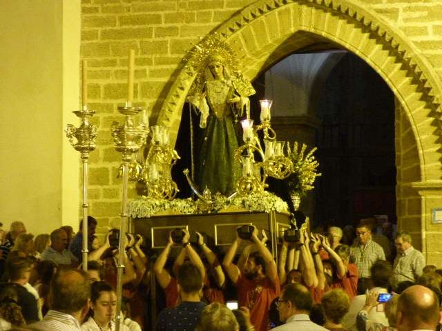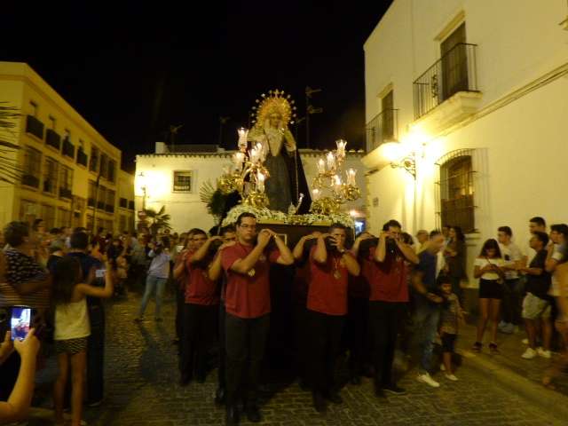 Portada en parihuela por hermanos costaleros y algún devoto que quiso sumarse a lo largo del recorrido, la virgen salía de la parroquia de Nuestra Señora de la O precedida de una comitiva en la que se pudo ver la cruz de guía y faroles, hermanos de cirio, representantes de algunas hermandades de penitencia y gloria que quisieron sumarse a esta cita y cuerpo de acólitos. Muchos fieles y devotos aprovecharon esta ocasión para ver a la Soledad como pocas veces se le ha podido ver, sin la cruz y vestida para la ocasión con el estreno de una saya verde de brocado en hilo de oro donada por una hermana y manto negro de terciopelo con recogido tipo antequerano. En la parihuela lucía en la parte delantera la media luna de plata que Nuestra Señora del Rosario Coronada, patrona de Rota, luce en su paso el día de su procesión.