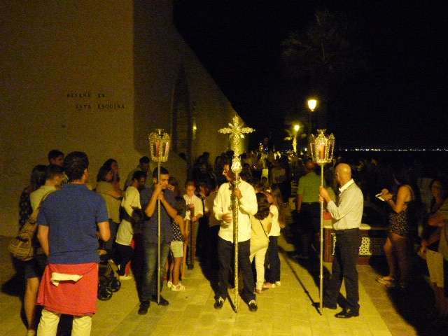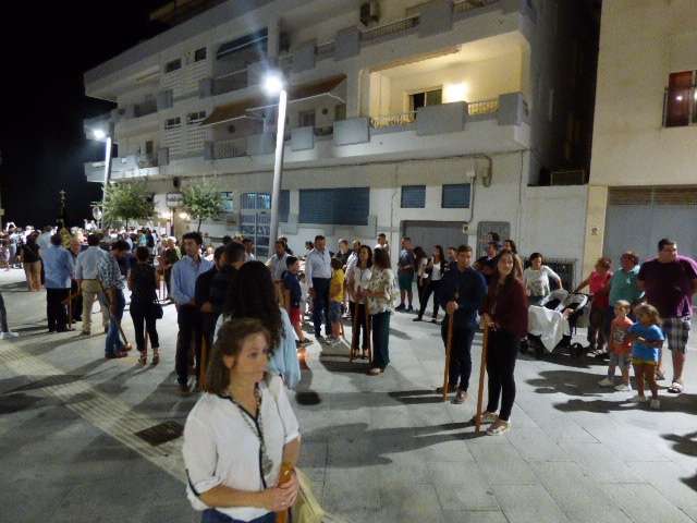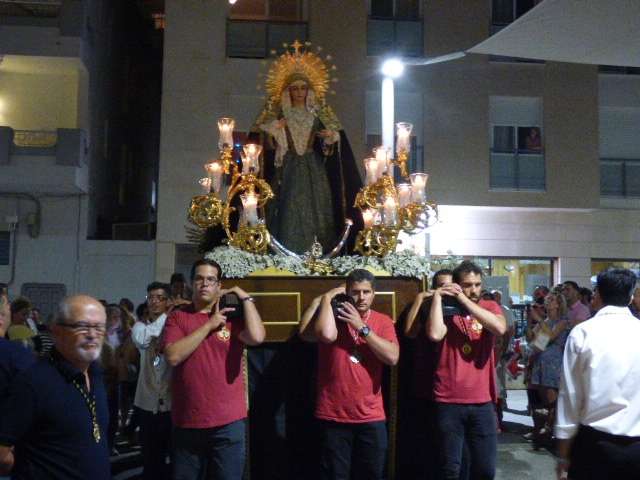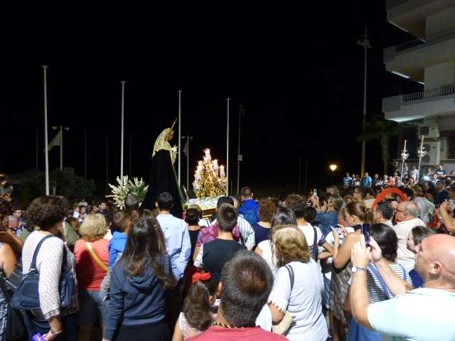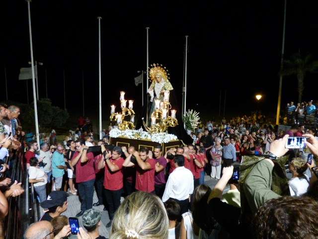 Al margen de este detalle que tuvo parada a la comitiva varios minutos, la virgen lució espléndida por el paseo marítimo por donde se fueron rezando los cinco misterios del rosario. Especialmente numeroso era el grupo de fieles que procesionaba detrás de la Soledad rezando y algunos tramos como la salida o la llegada a la plaza Jesús Nazareno, donde se concentró buena cantidad de ciudadanos que no pararon de inmortalizar con sus móviles esta salida nada habitual en esta dolorosa. De hecho, era la primera vez que presidía un rosario vespertino y que lucía fuera de su paso del Viernes Santo al pie de la cruz.