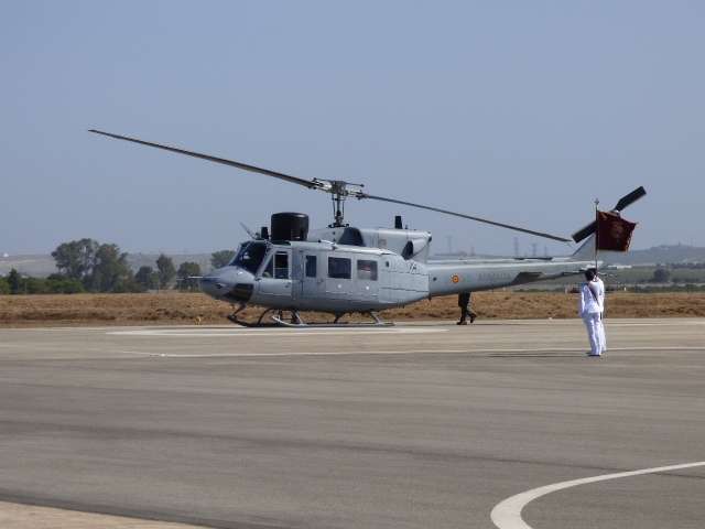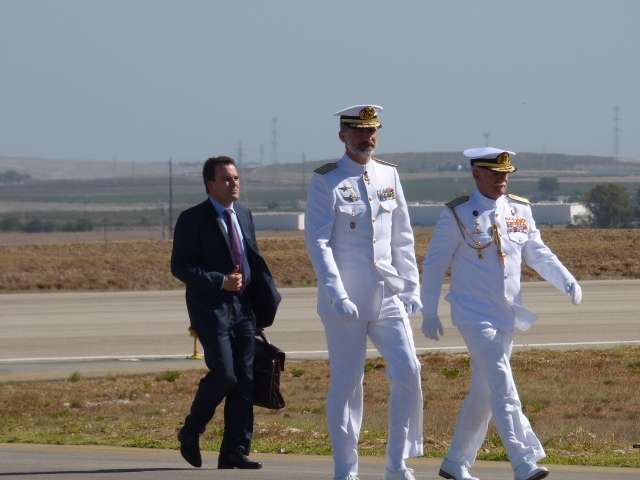 [Img #79202]Una vez acomodados los asistentes como público, entre los que se encontraban autoridades militares y civiles, como el alcalde de Rota, Javier Ruiz, el delegado del Gobierno en Andalucía, Antonio Sanz, la presidenta de la Diputación de Cádiz, Irene García, o el subdelegado del Gobierno en Cádiz, Agustín Muñoz, así como miembros de la Corporación municipal roteña y otros alcaldes de localidades como la de El Puerto de Santa María, llegaba la ministra de Defensa que ha esperado a pie de pista la llegada del Rey Felipe VI que lo hacía a bordo de un AB-212 modernizado de la Tercera Escuadrilla de la Armada.