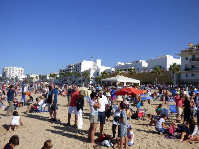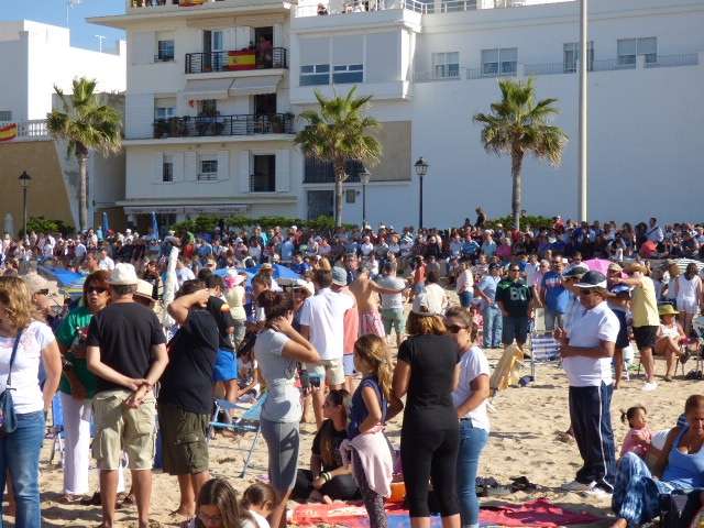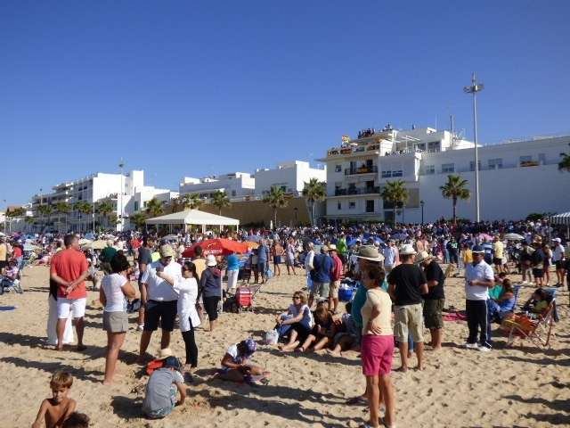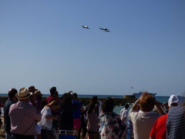 Una exhibición aérea que comenzó pasadas las once de la mañana y que a estas horas (13.00h) la están siguiendo miles de personas que se han apostado bien en la playa, en el paseo marítimo, en balcones o azoteas. Cualquier sitio era válido para ver en directo un espectáculo aéreo que pocas veces se puede ver tan cerca. Más de 50 equipos participan en esta demostración que por primera vez se celebra en la localidad, en este caso, gracias a la deferencia de la Armada española con la villa que lleva más de seis décadas acogiendo a los marinos, pilotos, tripulaciones y sus familias con destino en la Base Naval como parte de su población. Por eso, este acto, además de ser un homenaje a todos aquellos que han formado o forman parte del arma aérea de la Armada, es un agradecimiento expreso a los roteños y a Rota.