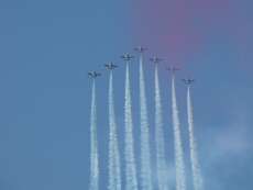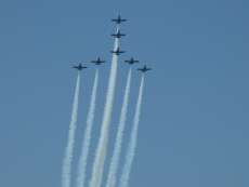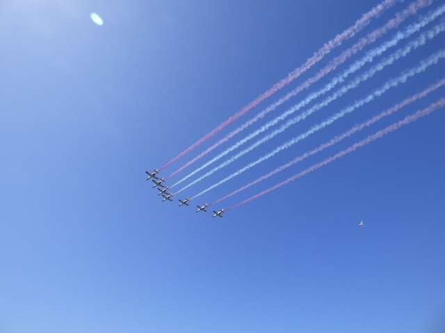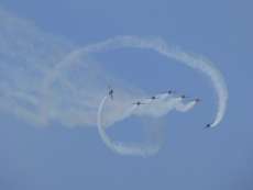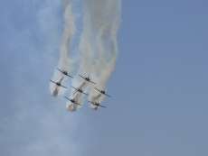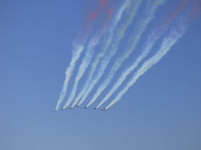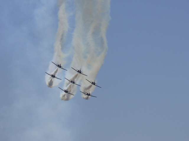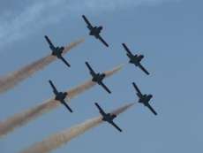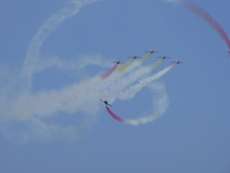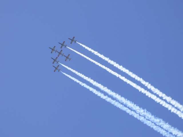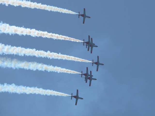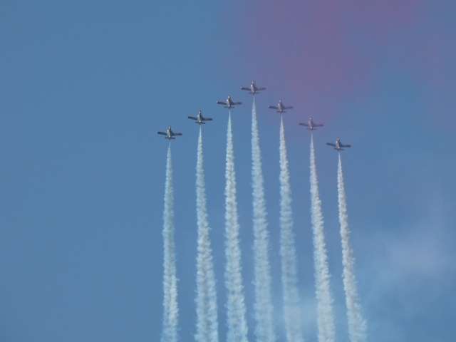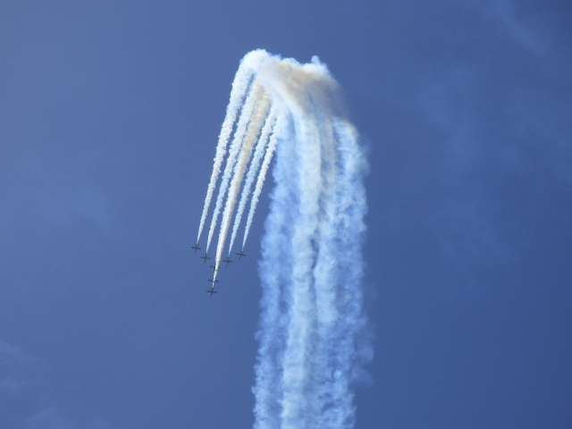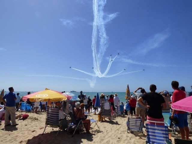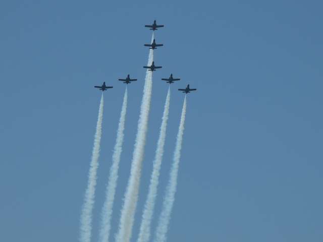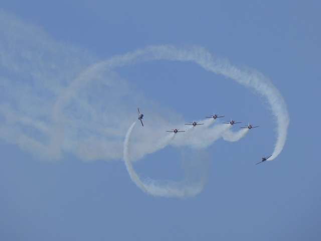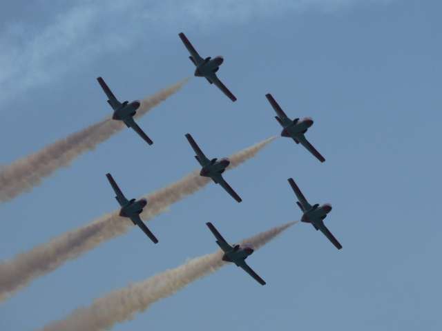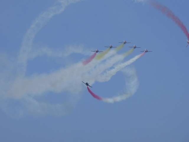 La mejor patrulla acrobática de España, la Patrulla Águila, con sus siete aeronaves y 11 pilotos han puesto esta mañana de sábado el broche de oro a una exhibición aérea que comenzaba pasadas las once de la mañana y que se ha prolongado hasta las 14.30 horas. Multitudinario seguimiento el que ha tenido esta demostración con más de 50 equipos en el aire pilotando hasta 20 aeronaves de diferentes modelos que han sido el principal atractivo de una jornada de sábado marcada por el respaldo de público al acto principal de conmemoración de los 100 años de la Aviación Naval en España.