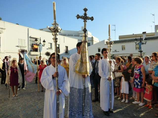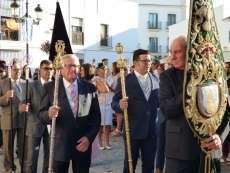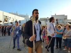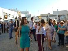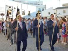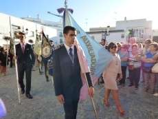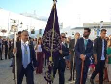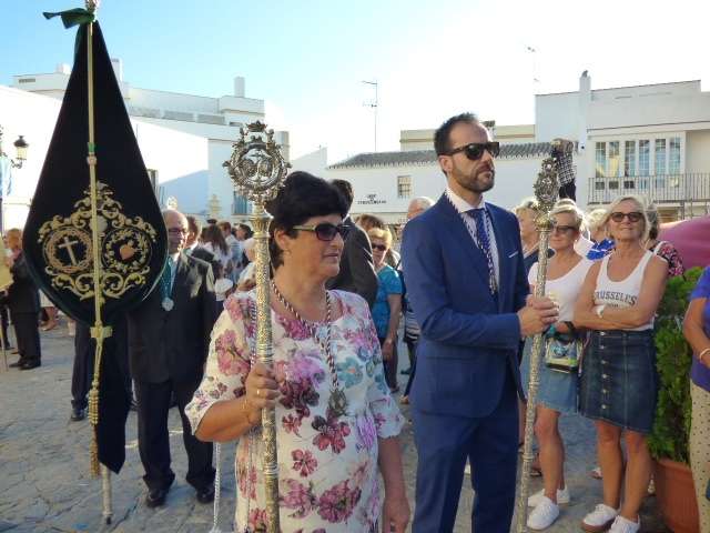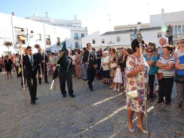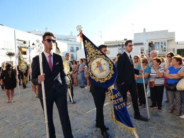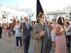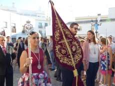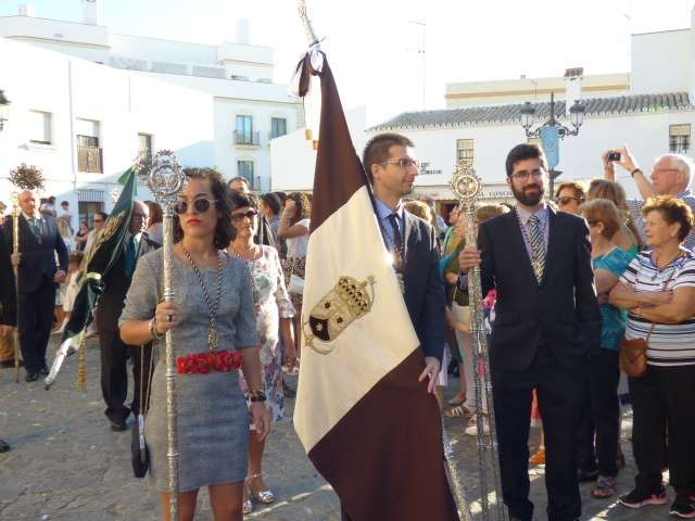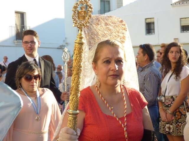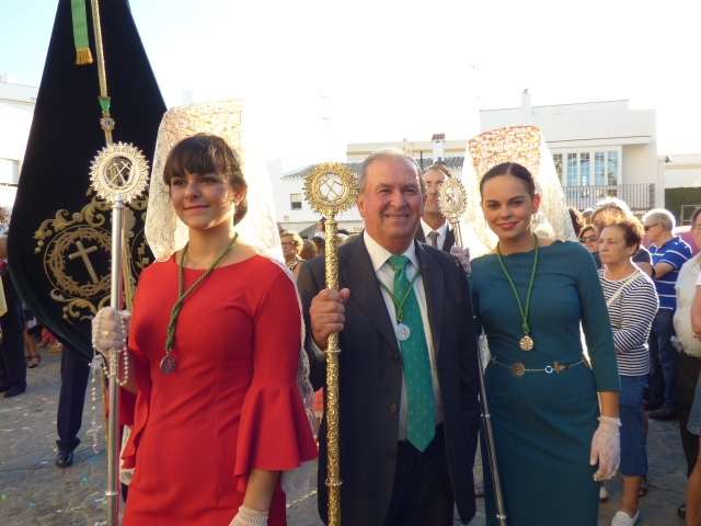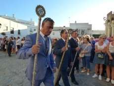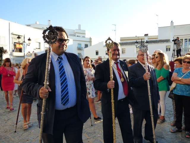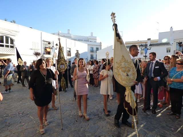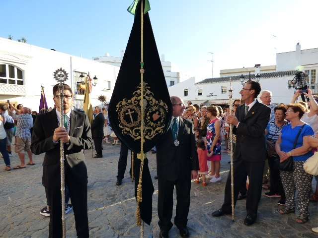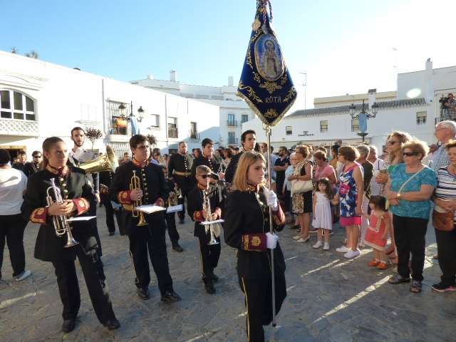 Antes de salir de la iglesia, la Hermandad del Rosario ha querido tener un detalle con las hermandades del Santo Entierro y San Isidro por la celebración de sus respectivos aniversarios, 400 años y 75 respectivamente. Tras este gesto, se ha iniciado una salida procesional que se ha visto arropada por muchos roteños y visitantes que no han querido perderse el momento en el que a las siete de la tarde, con el repique de campanas, aparecía por el dintel de la parroquia de la O la imagen de la virgen del Rosario. Ha sido una salida que se ha hecho esperar pero que con los acordes del himno nacional interpretado por la banda municipal de música "Maestro Enrique Galán", ha levantado los primeros aplausos de la tarde en reconocimiento a la cuadrilla de costaleros que un año más, ha guiado el capataz Manuel García.