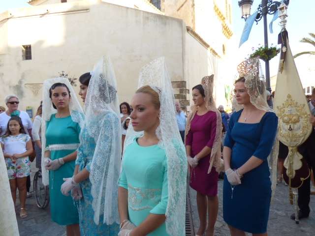 En las calles de Rota, el público esperaba la llegada del cortejo en el que se han visto a muchas mujeres luciendo la tradicional mantilla española, entre ellas, a las 11 damas del Rosario, que han dado mucho realce a uno de los cortejos más numerosos de los que procesionan en la localidad a lo largo del año.