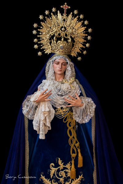 Tras finalizar recientemente sus estudios en la Universidad de Bellas Artes de Sevilla, este joven escultor presenta su primera obra de una dolorosa con un rostro de gran belleza donde el autor ha sabido tratar con exquisitez y naturalidad la expresión de tristeza de dolor de una madre tras el sufrimiento de la muerte de su hijo, y a su vez un rostro dulce que acerca aún más al recogimiento.