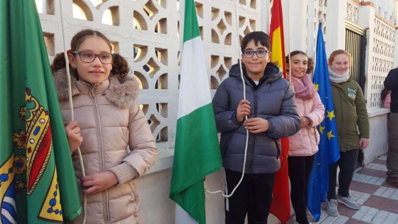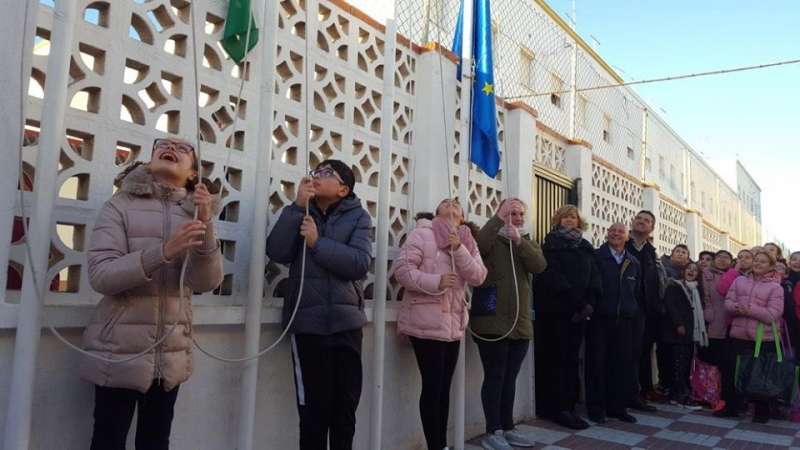 Izada de banderas como la del colegio Azorín, hasta donde se ha desplazado el alcalde, charlas didácticas sobre la Constitución y contestar preguntas y dudas del alumnado, alguna puesta en escena sobre el tema y otras actividades se han sucedido a lo largo de esta mañana para que los escolares conozcan la importancia de la Carta Magna.