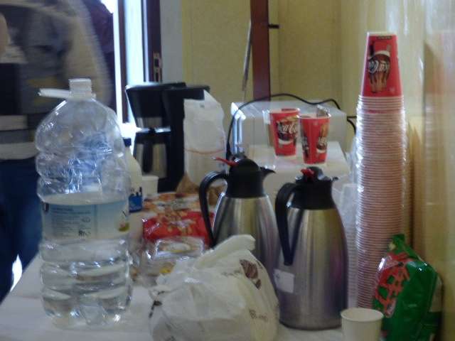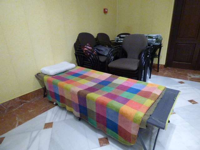 Hoy el salón multiusos del Castillo de Luna mostraba una imagen transformada donde se podían ver algunas pertenencias personales de las personas que se van turnando para pasar las horas en el encierro, de los que han pasado la noche, etc. El Ayuntamiento de Rota ha colaborado dejándoles calentadores, cafeteras, microondas, etc., para hacer la estanca algo más cómoda, pero la realidad es que la primera noche ha sido larga fuera de casa.