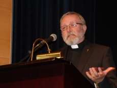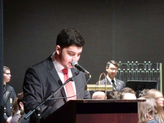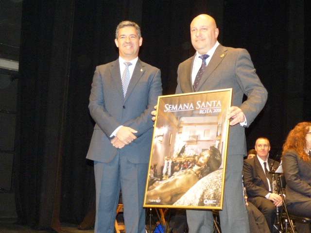 Tras este momento, el turno de intervenciones ha continuado con el vicepresidente del Consejo Local de Hermandades y Cofradías, Juan Castellano Martínez, que aparte del capítulo de agradecimientos a la banda de música, al autor del cartel, a las hermandades, al asistente eclesiástico, a los participantes en el concurso de fotografías, a la Hermandad del Santo Entierro por los actos de su 400 aniversario y al Ayuntamiento, ha deseado una buena Semana Santa para todos los cofrades roteños y una buena andadura a Diego Vidal como consejero de las hermandades durante los próximos cuatro años. Un cargo que le ha encomendado el Obispado, como el propio asistente eclesial reconocía en su intervención, poniéndose a disposición de todos y trasladando el mensaje claro de que lo importante de la presentación del cartel de la Semana Santa no es el cartel el sí, que es verdad que esconde cultura, tradición, arte y patrimonio, sino lo que refleja, que es que Dios se hizo hombre y murió por la humanidad para luego resucitar. Ese, decía, es el mensaje con el que deben quedarse los presentes a los que invitó a vivir una semana de pasión, muerte y resurrección de Cristo plena y reflexiva.