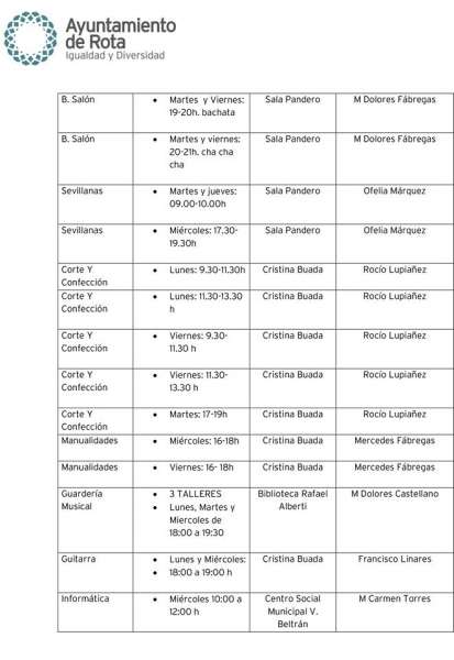 Los grupos tienen que estar formados por un mínimo de 10 personas para que se sigan impartiendo habiendo este año algunos cambios de ubicación como los talleres de sevillanas y bailes de salón que se trasladan a la Sala Pandero. También se han eliminado el de taller de alemán por la tarde y el de bordado, por falta de demanda.