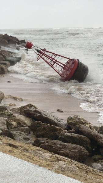 Esta mañana también aparecía la boya del Quemao en la orilla de la cala que forma el espigón del hotel Duque de Nájera con el del muelle pesquero, señal de la bravura del oleaje que sigue en la jornada de hoy.