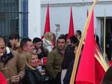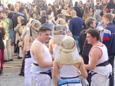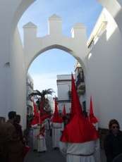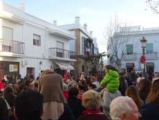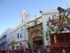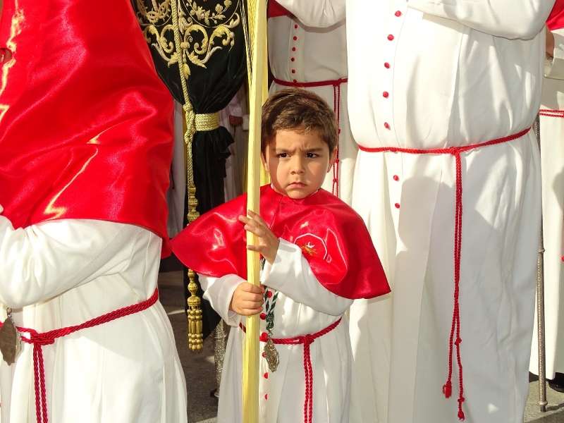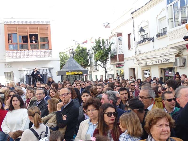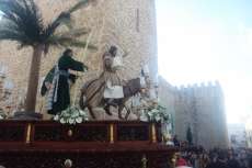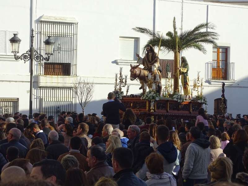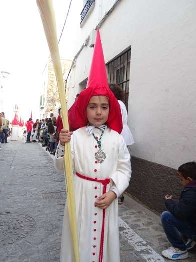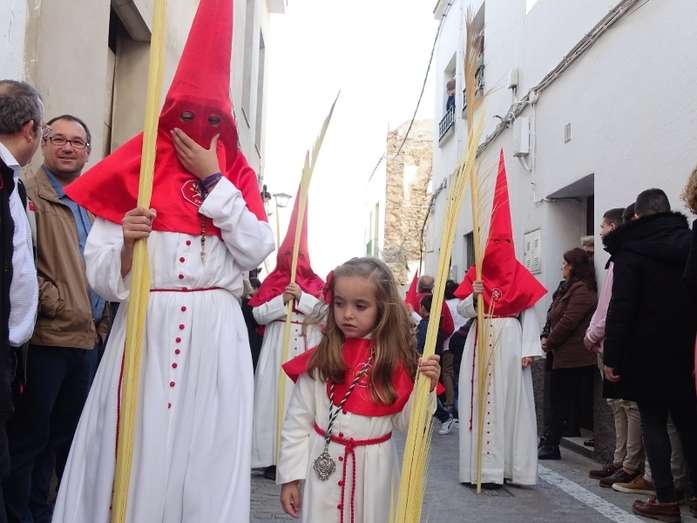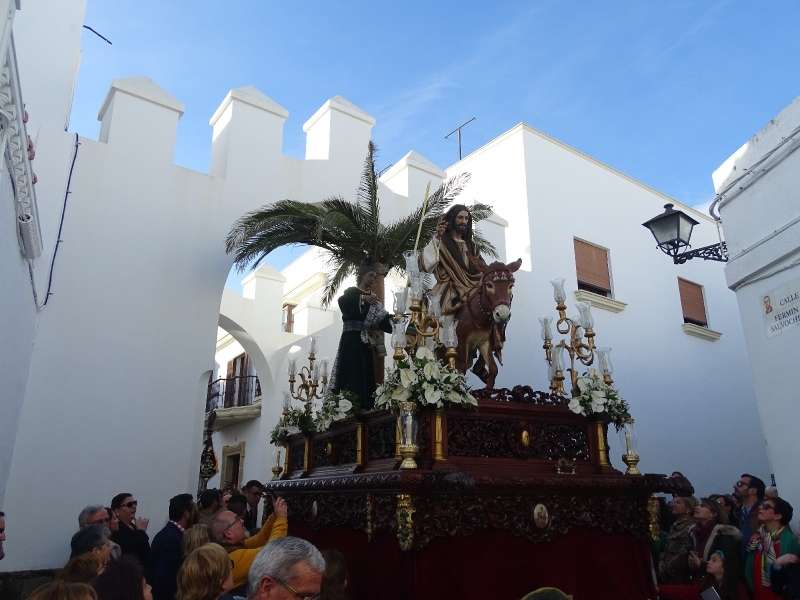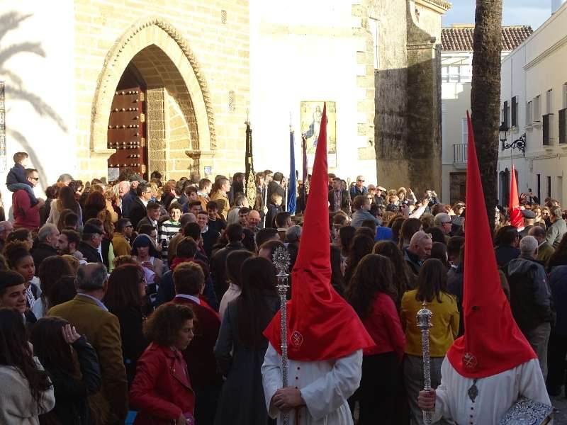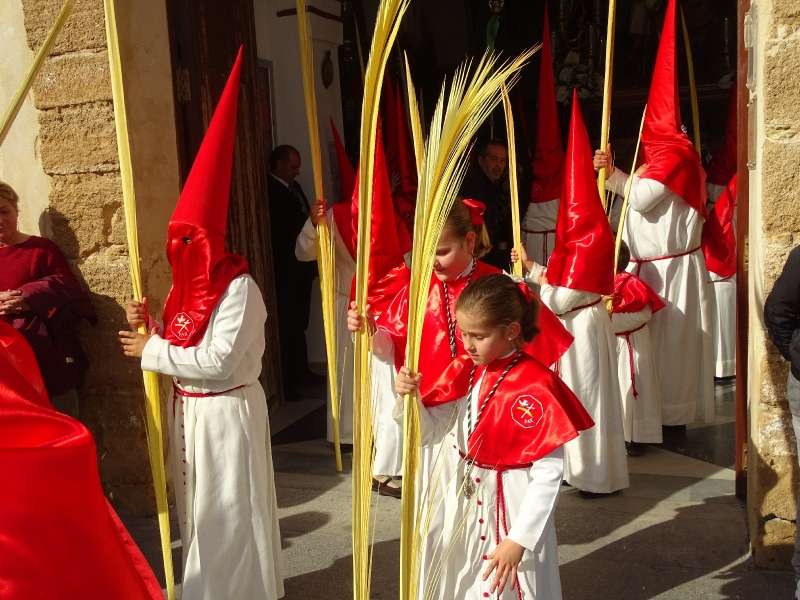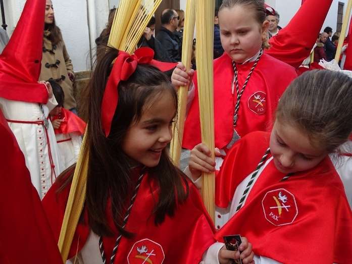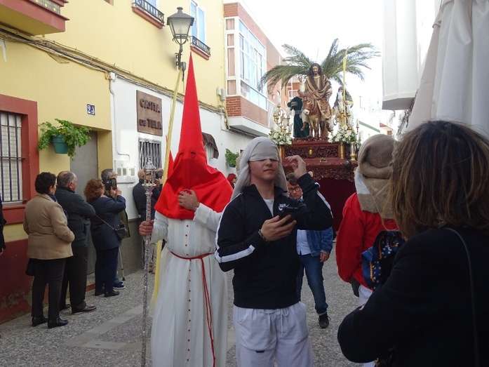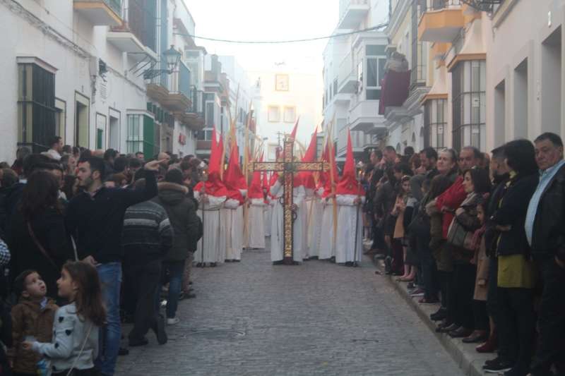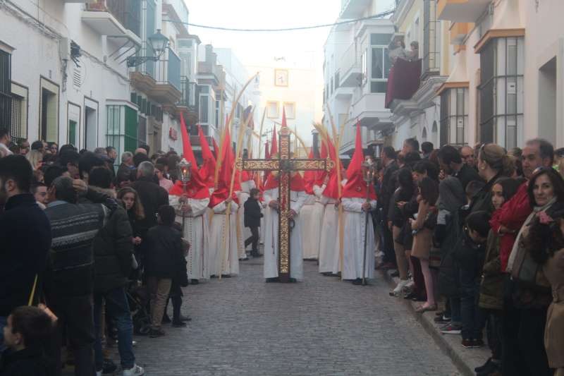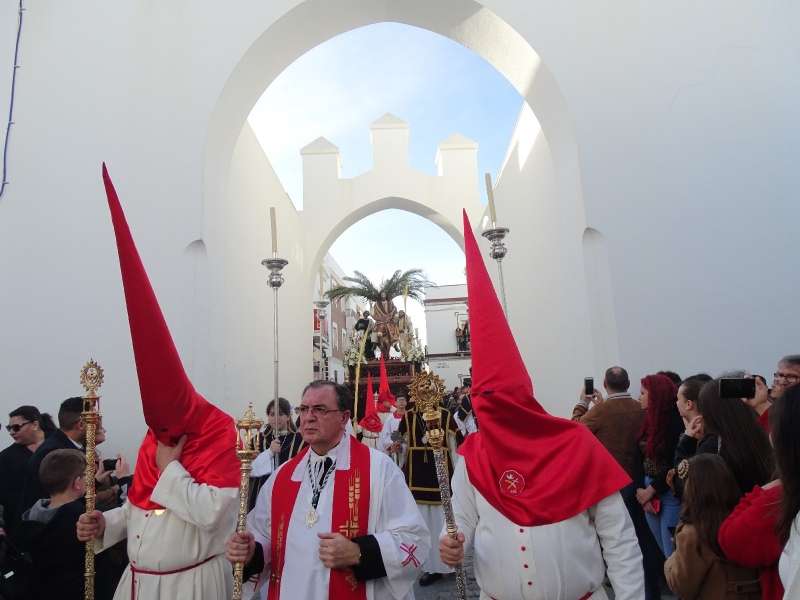 Había ganas de ver pasos  y roteños y turistas salieron a arropar a Nuestro Padre Jesús de la Paz en su Triunfal Entrada en Jerusalén que sobre las seis de la tarde aparecía por la puerta de la capilla de San Roque, sede de la Hermandad de la Veracruz, que cada año da la bienvenida a la semana más importante del año  para los cofrades. Días en los que se rememora la pasión, muerte y resurrección de Cristo pero que en este Domingo de Ramos todavía es jornada de alegría. La presencia de muchos niños penitentes formando parte de un cortejo de unos 120 hermanos que portan palmas y visten túnica blanca y antifaz rojo, lo demuestra.
