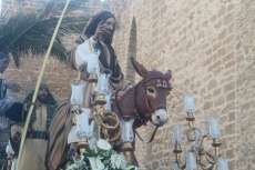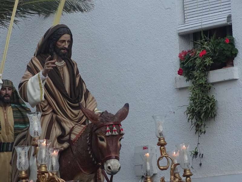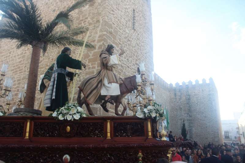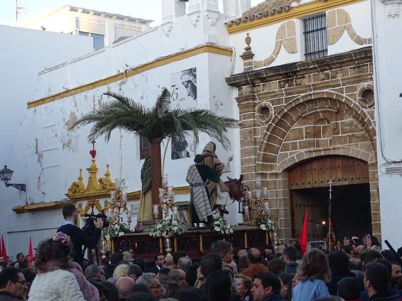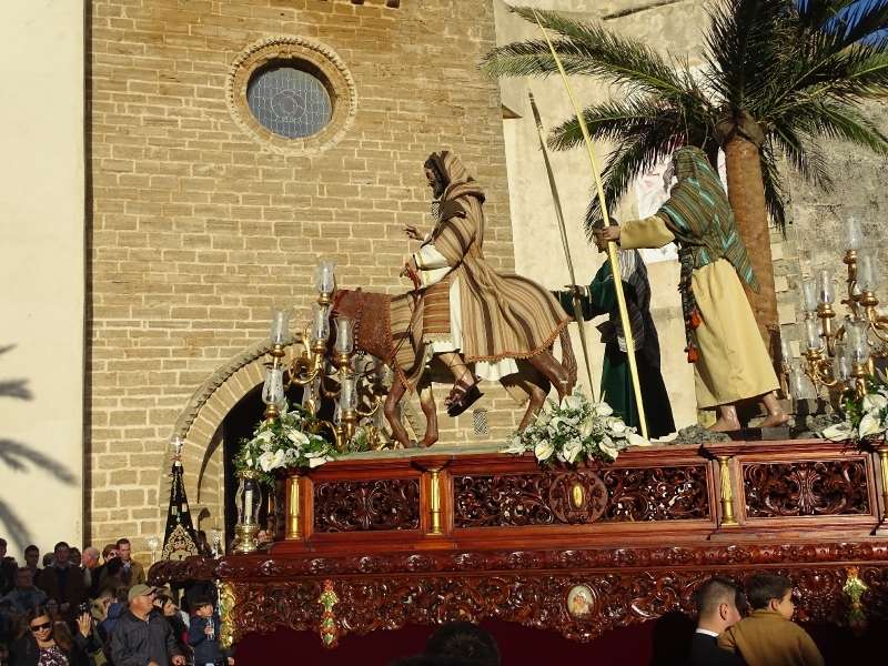 La Borriquita, que ese año lucía con las figuras que componen el conjunto escultórico  vestidas al estilo hebreo, ha gustado en la calle. Es un estilo que ya se eligió en 2015 y que tres años después han vuelto a elegir desde la junta de gobierno para Jesús de la Paz, Santiago y San Juan. Tres imágenes que forman un conjunto iconográfico que ayer se pudo ver por las calles para alegría de muchos que temieron que este titular pudiera quedarse en casa a juzgar por el chaparrón de primera hora del domingo. La Borriquita es obra del imaginero roteño Miguel Ángel Caballero Pérez y data de 2008.