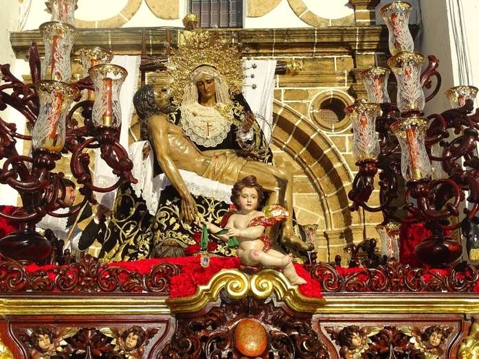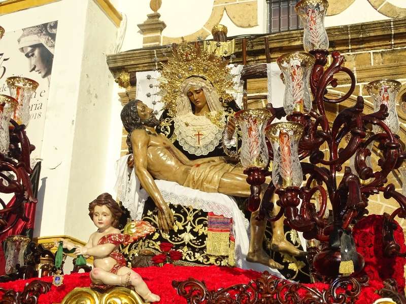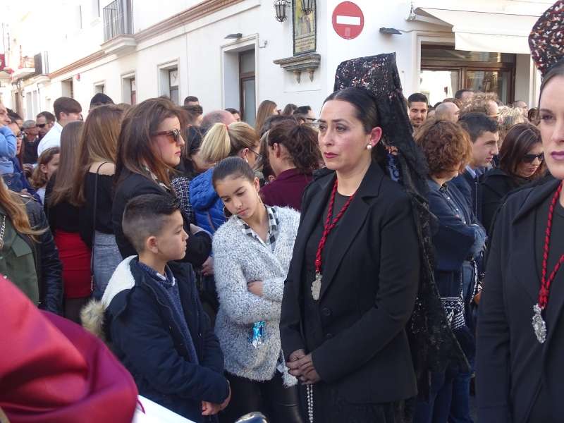 La dolorosa con su hijo en el regazo al pie de la cruz, pisando un monte de claveles rojos es una estampa propia del Jueves Santo roteño que ha dejado buenas sensaciones para iniciar una Madrugá sobre la que pesan incertidumbres por los partes meteorológicos que pronostican que sobre las 6 de la mañana podría llover. A la espera de ver si esas predicciones se cumplen, lo que está claro es que Los Dolores han lucido con esplendor en una tarde que poco a poco ha ido mejorando en temperaturas y ha permitido un buen ambiente cofrade en la villa.