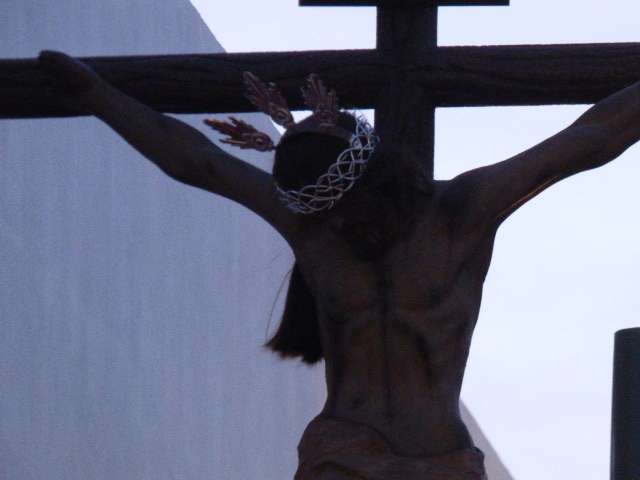 Por cierto, exorno floral pésimo. Sobre todo el del crucificado. Intercala algo en el monte de claveles, yedra, lirios... algo que le de vistosidad; además eché en falta unas jarras a los laterales del Señor, que otras veces ha sacado. Y una última cosa, el paso pide a gritos unos GUARDABRISAS y quitar esos hachones...
