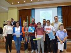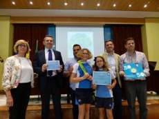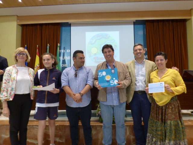 Tras la proyección de un vídeo con imágenes de algunas de las charlas, actividades o talleres que se han llevado a cabo en este curso escolar para promover ese espíritu de cambio en el modelo energético que se persigue desde el Ayuntamiento para hacer de Rota una ciudad más sostenible, el alcalde Javier Ruiz y miembros de la Corporación municipal han entregado los distintivos, cheques y otros regalos a cada uno de los colegios.