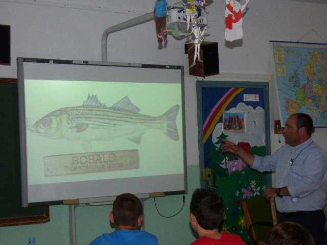 Esta mañana, parte de esos alumnos, concretamente los de 5º de Primaria del colegio San José de Calasanz, han participado en una charla que ha ofrecido el corralero y presidente de la asociación, David Campos que, normalmente junto a otros compañeros, explica al alumnado de los diferentes colegios que se apuntan, todo lo relacionado con Los Corrales. Y es que si algo se quiere proteger, lo primero, es educar en ello, darlo a conocer, mostrar su importancia y crear conciencia sobre aquella acción del ser humano que puede perjudicarlo. Es básicamente el mensaje y el objetivo de estas sesiones que se dividen en dos partes: una teórica, donde dos corraleros explican en clases la historia de este arte de pesca milenaria, las especies que se pueden capturar, cómo se despesca, qué es un corral, cómo se mantiene, qué utensilios se usan para el despesque, etc., ayudándose de fotografías y vídeo; y otra parte práctica, donde los alumnos se trasladan desde su colegio a Los Corrales para ver in situ, también de manos de los corraleros, todo lo visto anteriormente en las aulas.