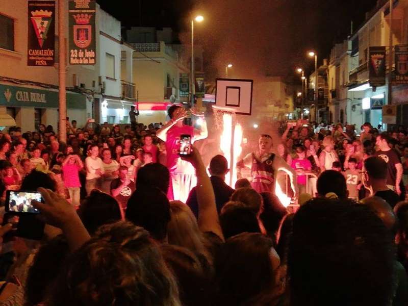 [Img #95243]Este año, la peña cadista "El Camaleón" que organiza su quema frente al bar "La Moderna" en la avenida María Auxiliadora, quemaba a la deportista Beatriz Sánchez Marrufo, campeona de Europa de Baloncesto con la selección española y al Club Atletismo "Vía Verde" por sus numerosas participaciones en carreras, medias maratones y maratones en muchos puntos de la provincia, Andalucía y España llevando el nombre de Rota por todos lados. Ambos recibían homenaje antes de arder en la hoguera encarnados en dos grandes muñecotes.