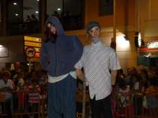 Por su parte, la Asociación "Jentos y Jentas", que organiza su quema en el cruce de la avenida San Fernando con avenida de Sevilla, dedicaba sus "juanillos" a dos artistas locales como Roman Lokati y la actriz Tatiana Sánchez Garland. Ninguno de los dos estaban en la localidad, ya que ambos trabajan fuera, pero la madre de la actriz de ha encargado de prender fuego a los muñecotes que han ardido rápido ante una masa de público importante.