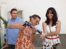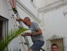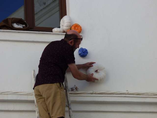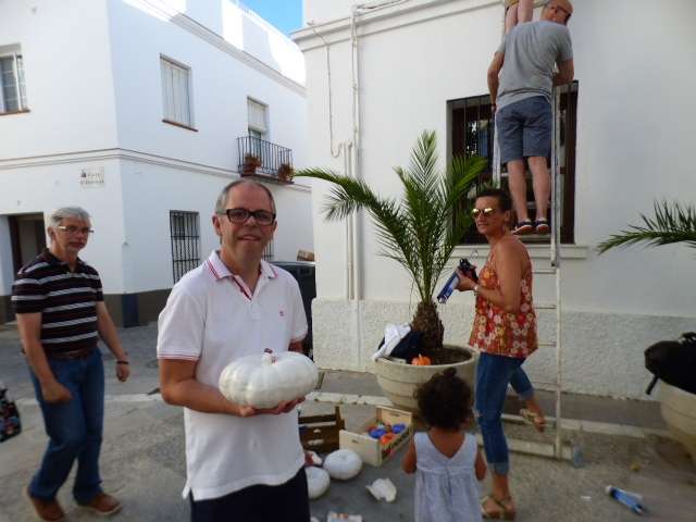 Los integrantes de "Intervenciones en Rota", Juan Curtido, Juan José Varela y Ana Muruve, fueron los encargados de colocar las calabazas en las fachadas con la ayuda de los artífices de las mismas, los chicos del "Pili Varo" que acudieron entusiasmados para ver su obra expuesta.
