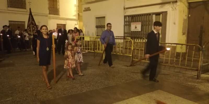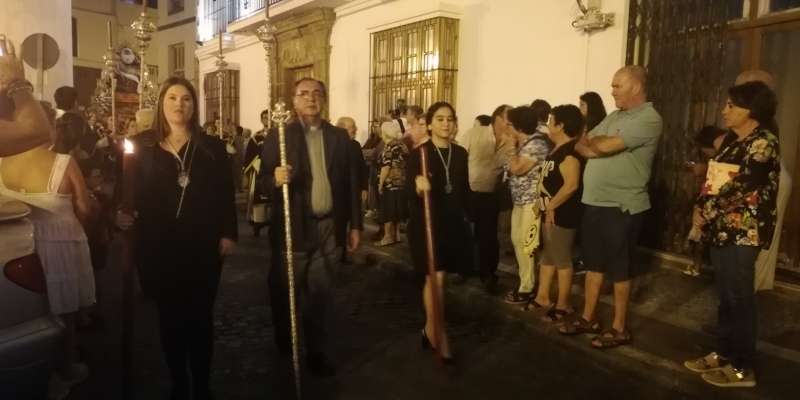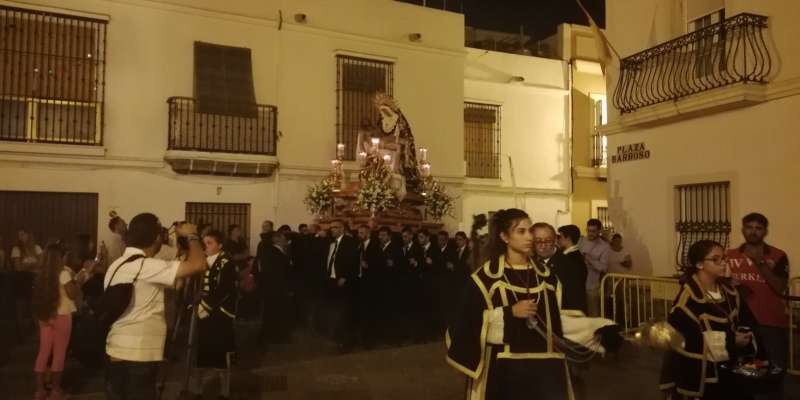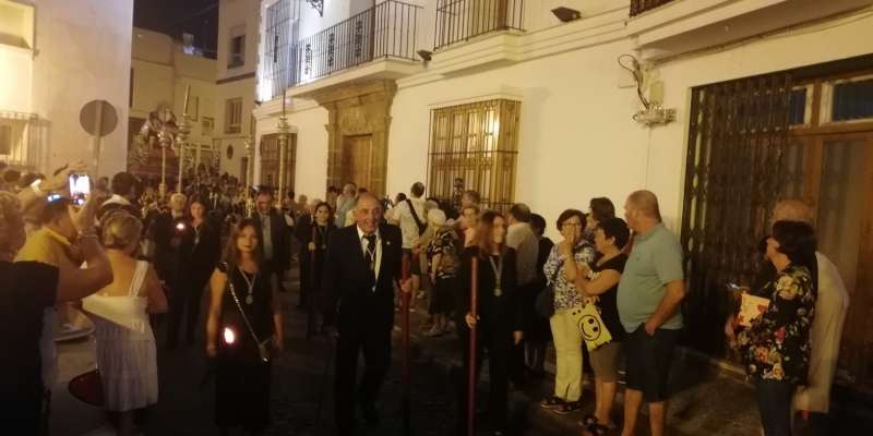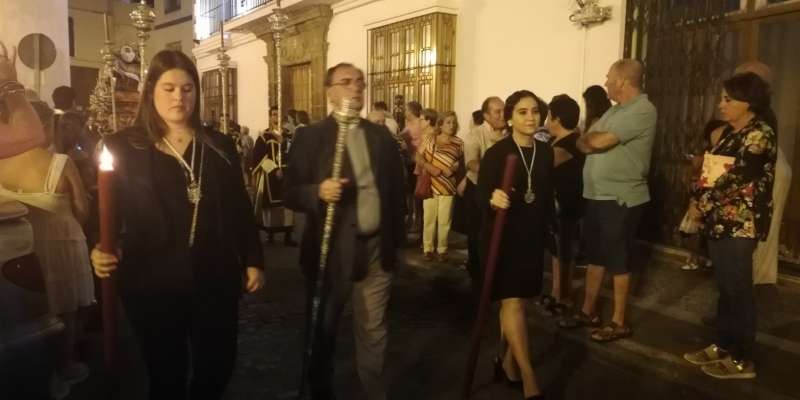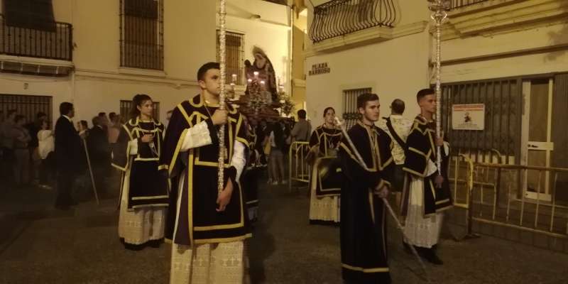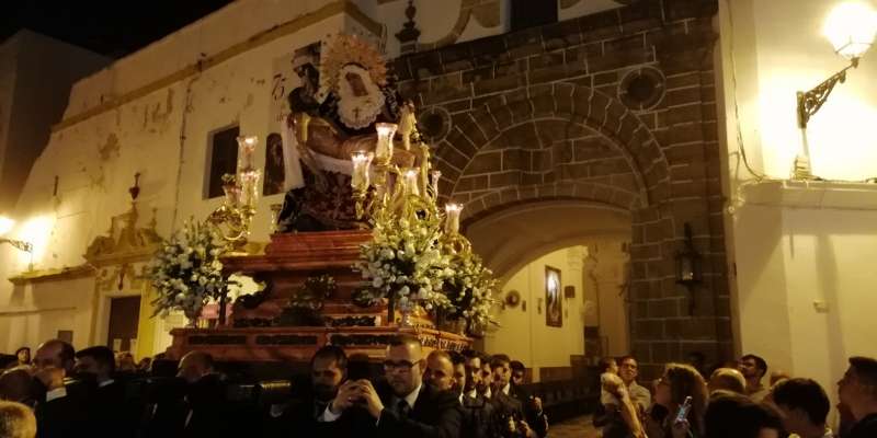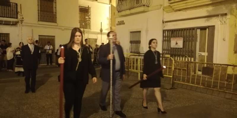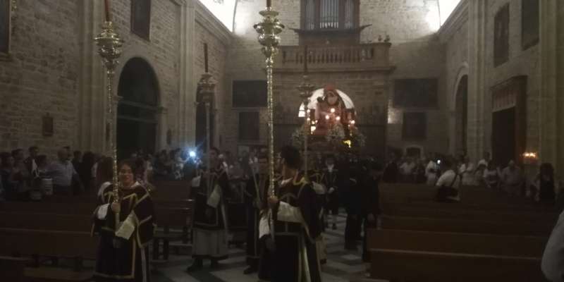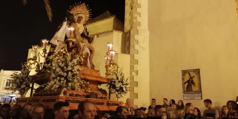 A las 21.30 horas abrían las puertas de la capilla de la Caridad para dejar pasar a unos 50 hermanos que portaban cirios e insignias y que precedían el conjunto escultórico que forma la virgen de los Dolores con su hijo en brazos. Portado por una parihuela, el cortejo se hizo hueco entre numerosos ciudadanos que quisieron acompañar a la hermandad en esta cita especial, llenando la plaza de Andalucía y las inmediaciones hasta llegar a la iglesia de la O.