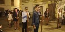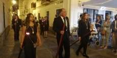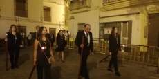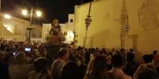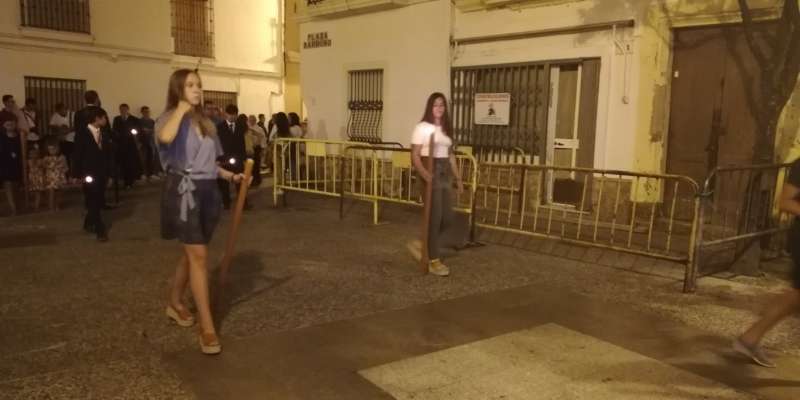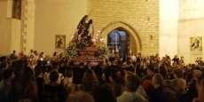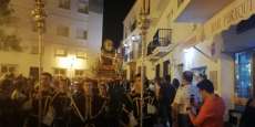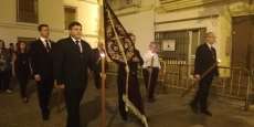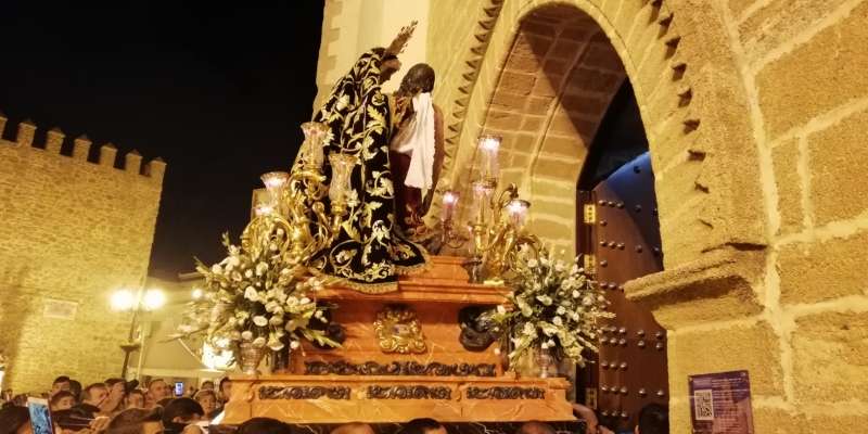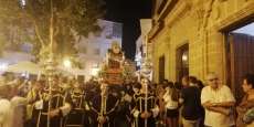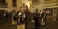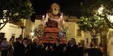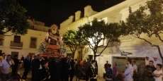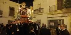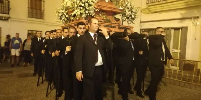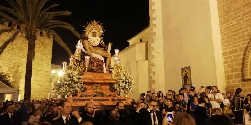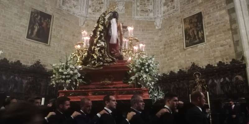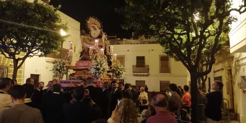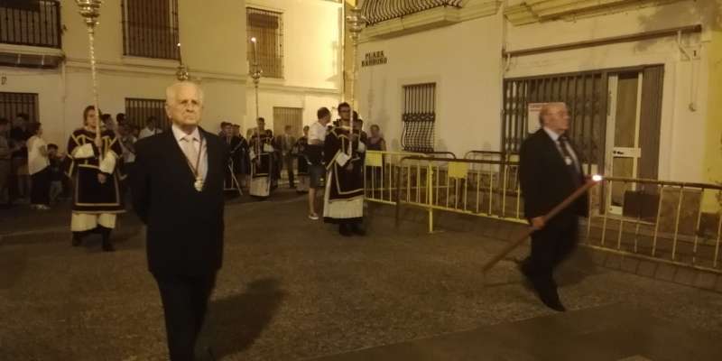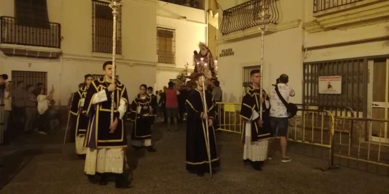A las 21.30 horas abrían las puertas de la capilla de la Caridad para dejar pasar a unos 50 hermanos que portaban cirios e insignias y que precedían el conjunto escultórico que forma la virgen de los Dolores con su hijo en brazos. Portado por una parihuela, el cortejo se hizo hueco entre numerosos ciudadanos que quisieron acompañar a la hermandad en esta cita especial, llenando la plaza de Andalucía y las inmediaciones hasta llegar a la iglesia de la O.