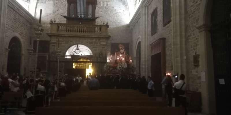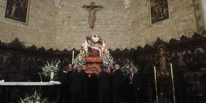 Una vez dentro del interior de la parroquia, donde se llegó una media hora después, los hermanos costaleros, guiados por Pedro Merino y Ramón Acuña, colocaron las imágenes en el altar donde desde hoy, presiden el septenario. Del 7 al 12 de septiembre será a las 20.00 horas y el día 13, a las 19.30 horas. Será a las ocho de la tarde cuando la virgen de los Dolores y el Cristo de la Caridad emprendan el trayecto de vuelta a su capilla, esta vez, con un recorrido más largo que el de ida.