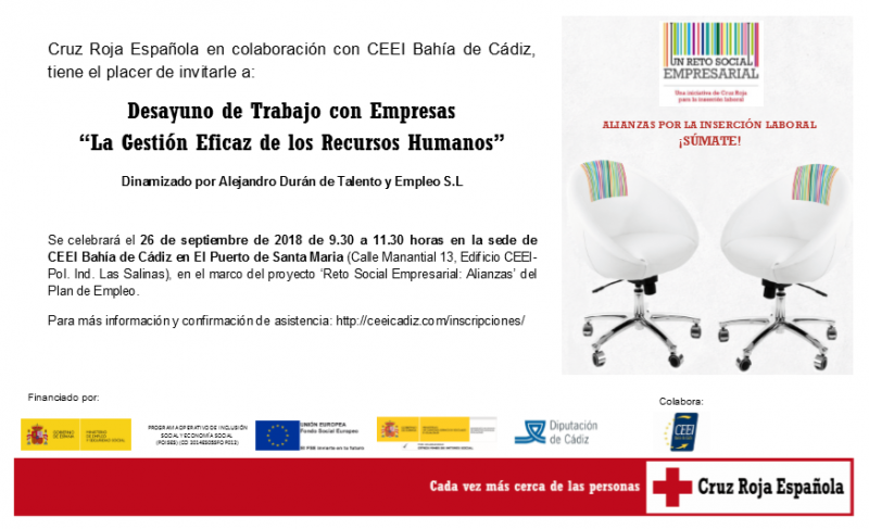 Por otro lado, el 26 de septiembre se llevará a cabo un desayuno de trabajo con empresas sobre "La Gestión Eficaz de los Recursos Humanos", impulsado por Cruz Roja con la colaboración del CEEI.