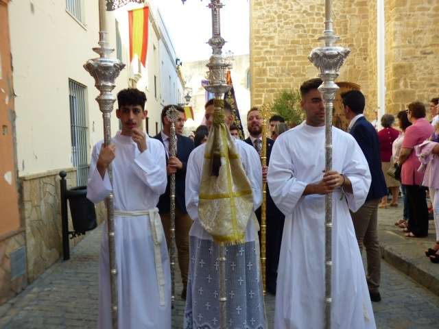 Mucho público en la calle y una larga comitiva en la que se pudieron ver asociaciones parroquiales, todas las hermandades de penitencia y gloria de Rota en orden de antigüedad representadas por hermanos mayores y miembros de la junta de gobierno que portaban su estandarte, las damas del Rosario junto a la dama mayor luciendo la tradicional mantilla española, otras tantas mujeres representantes de hermandades también con mantilla, autoridades civiles y militares junto a hermanos de la Hermandad de Nuestra Señora del Rosario que en estos días ha vivido las jornadas más importantes del año.