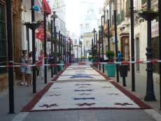 En la salida procesional de este 7 de octubre, gracias a la labor de los jóvenes cofrades de muchas hermandades locales, la virgen ha podido volver a pisar una alfombra de sal que se ha recuperado tras muchos años. Era sencilla, pero hecha con mucho trabajo y esfuerzo desde ayer por la tarde cuando se pudo ver a los chavales de muy distintas edades afanarse en extender kilos de sal blanca y pintada, usar plantillas para decorar un pequeño pasillo en la calle Charco en honor a la virgen.