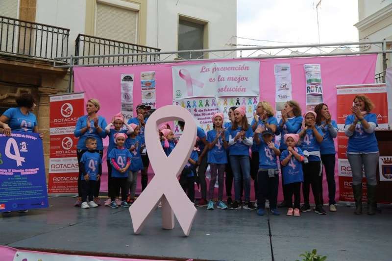 Luchar contra el cáncer ha sido la excusa para que en la tarde del sábado cientos de roteños e incluso algunos vecinos de localidades cercanas se hayan animado a participar. Se ha batido un nuevo récord de participación y eso, pese a la lluvia que ha hecho acto de presencia especialmente cuando apenas acababa de comenzar la marcha solidaria. Antes, en la plaza de España e inmediaciones se vivían momentos de mucho ambiente con la llegada del gran lazo rosa portado por niños y socias colaboradoras de Rolucan, la entidad que ha logrado impulsar esta carrera y marcha como jamás habían pensado.