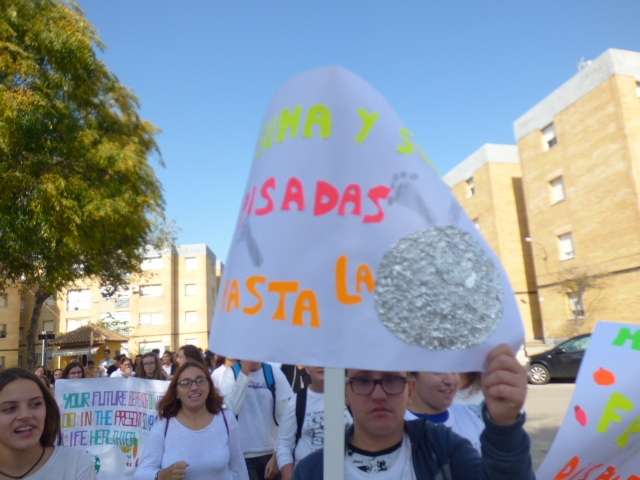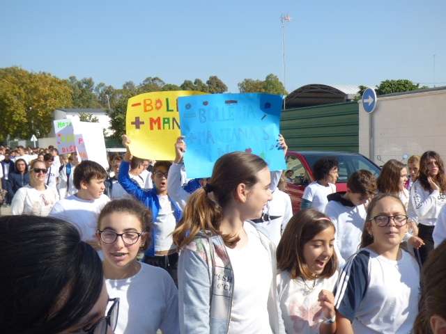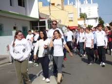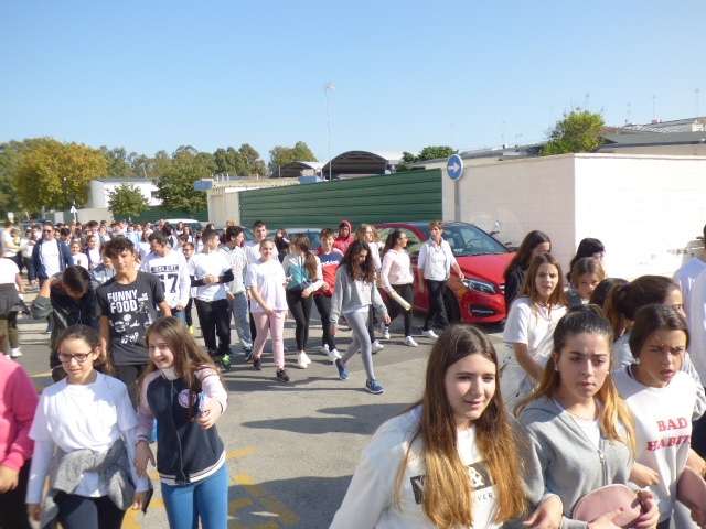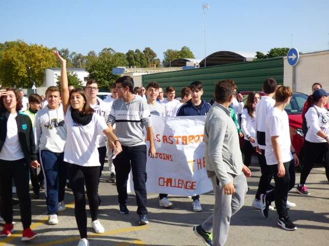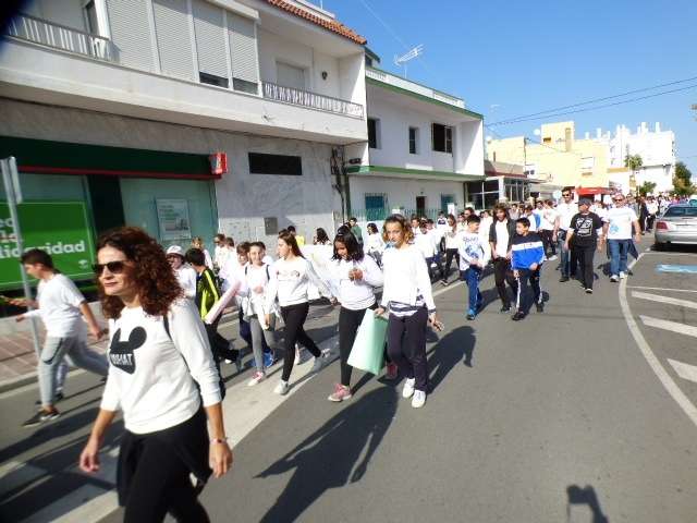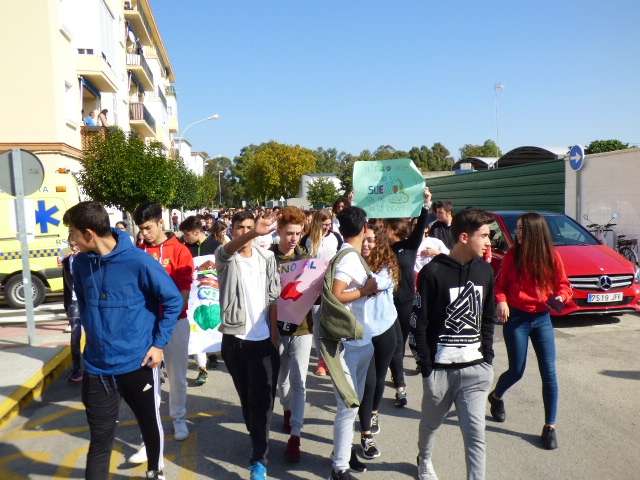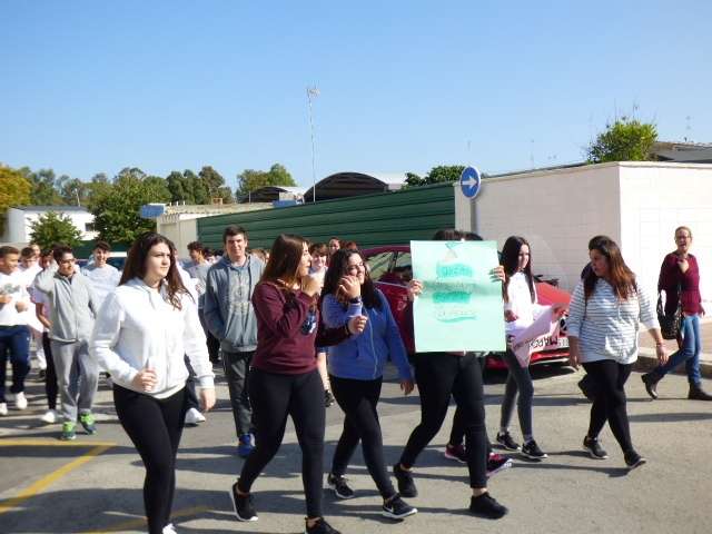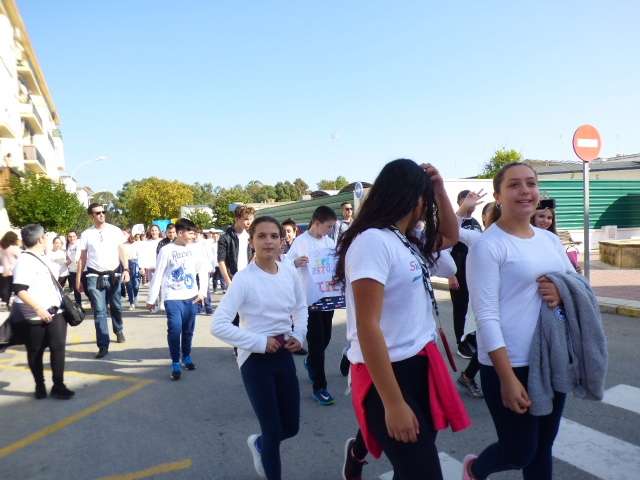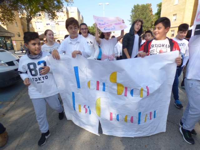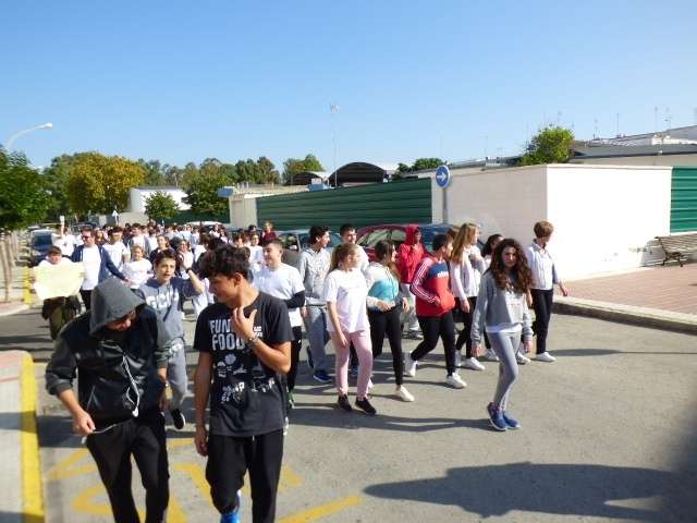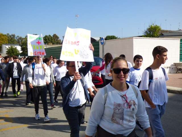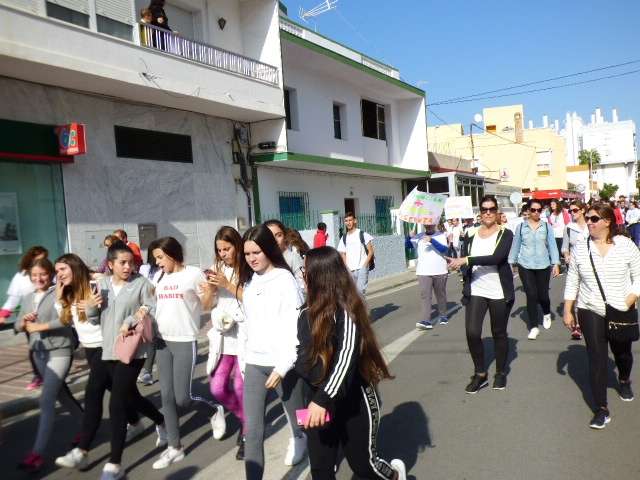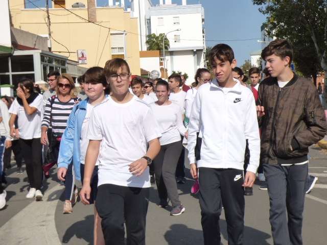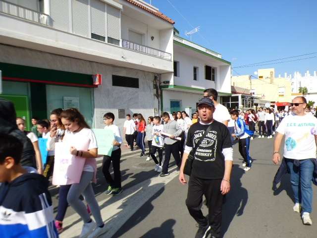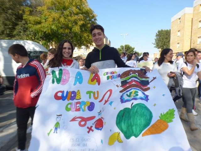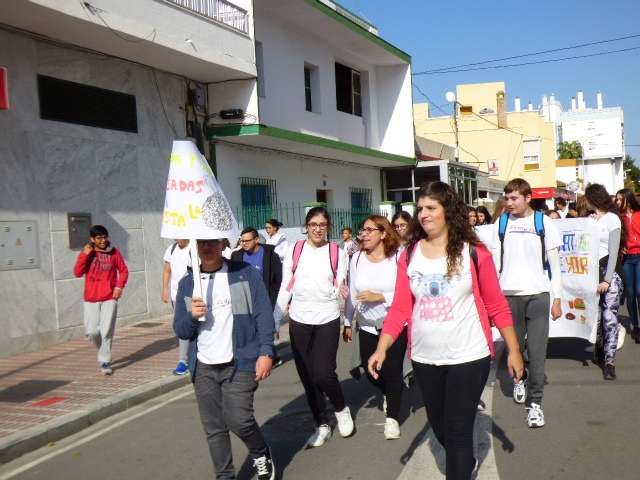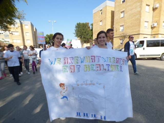 Alumnos, profesores y algunos padres y madres de alumnos han participado en esta iniciativa global en la que han participado otros centros escolares, institutos, clubes y entidades de otras ciudades. En realidad, la actividad estaba programada para el pasado lunes 12 de noviembre, coincidiendo con el Día Internacional contra la Obesidad Infantil. Todos los participantes inscritos este año en el proyecto a nivel nacional e incluso de otros países, debían salir a la calle a la misma hora a realizar esta marcha a favor de la alimentación sana, pero la lluvia que estuvo presente prácticamente toda la mañana hizo que en Rota tuviera que aplazarse su celebración. Por eso, ha sido hoy cuando la comunidad educativa del IES Astaroth ha salido a la calle. Lo han hecho por una vida sana, apostando por el ejercicio físico y por los buenos hábitos alimenticios.