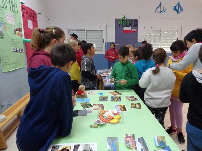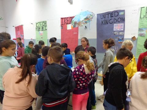 Además, una vez termina el tiempo en el avión, los escolares tienen la oportunidad de visitar 8 países, en forma de stands, donde sus compañeros de quinto curso les explican las principales características de cada uno, sus monumentos, costumbres, gastronomía, ubicación del país, monedas, etc.