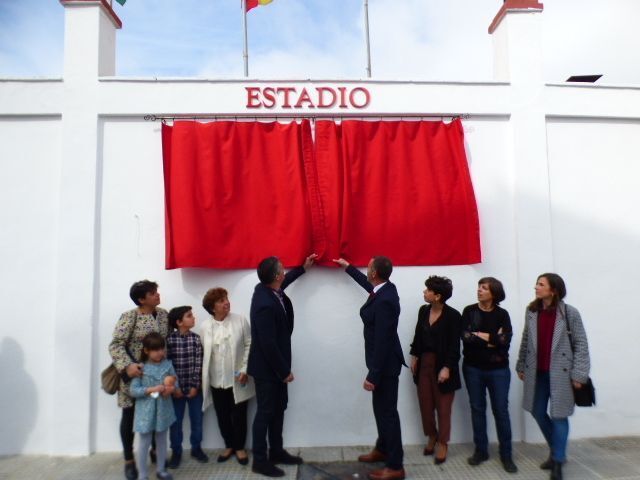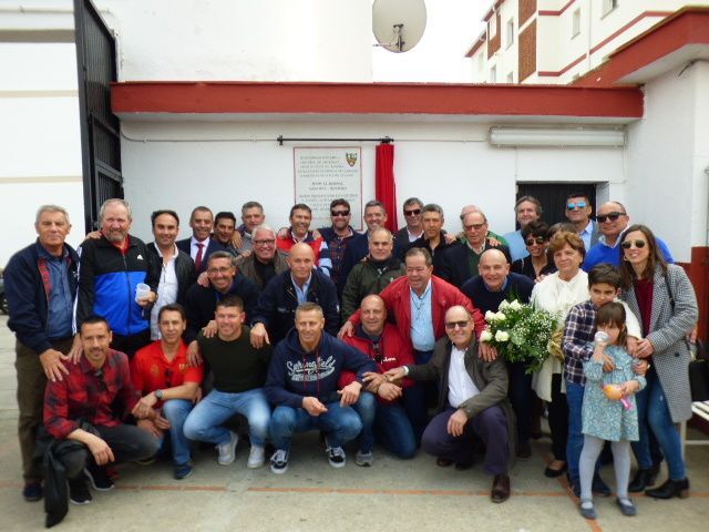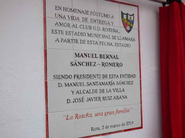Tras el acto de intervenciones, fueron el alcalde de Rota, Javier Ruiz, y el presidente de la UD Roteña, Manuel Santamaría, los que acompañados de la familia, descubrieron la nueva rotulación exterior del estadio y posteriormente, el azulejo que en el interior de las instalaciones, también luce en recuerdo del que está considerado como eterno presidente de la entidad.