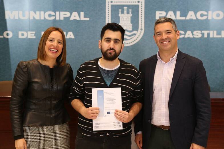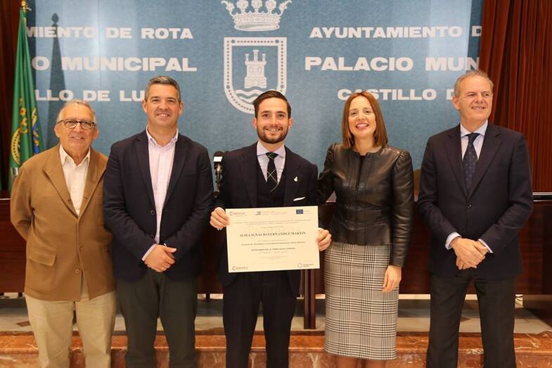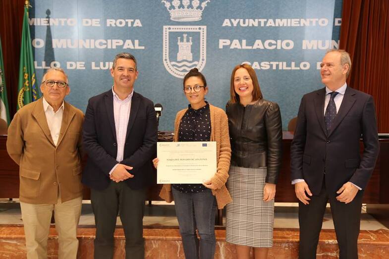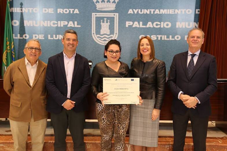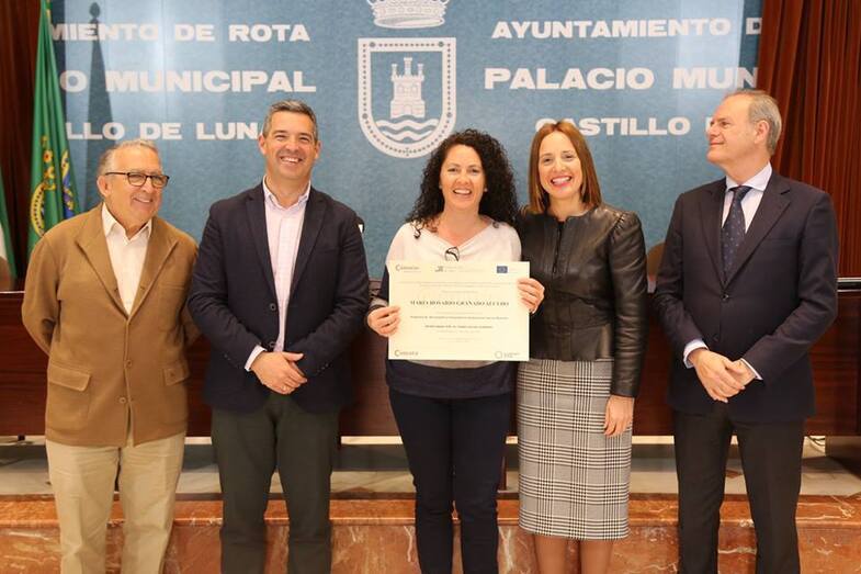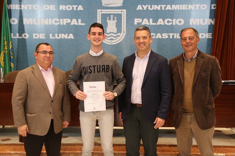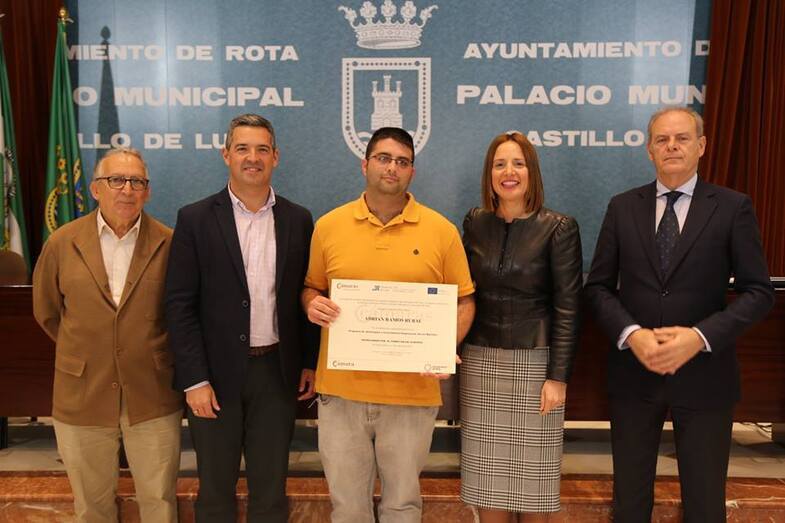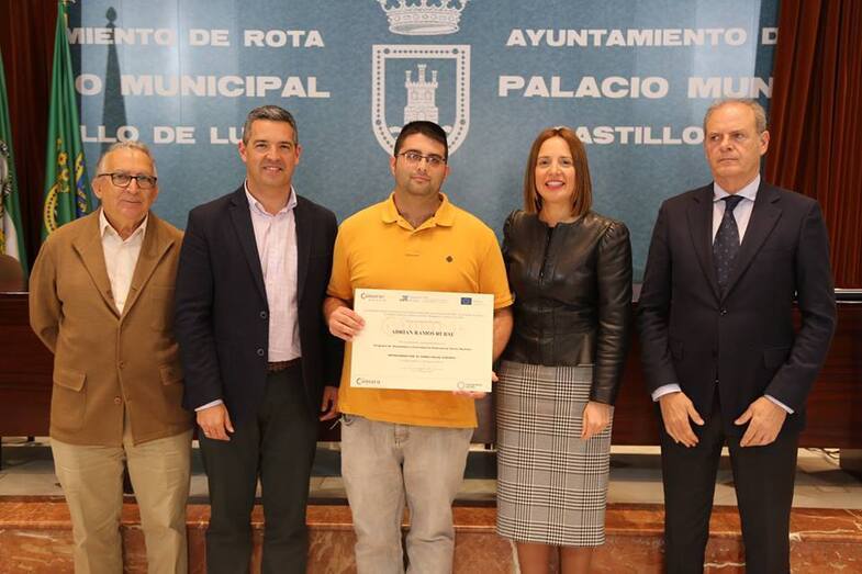 El alcalde de Rota, Javier Ruiz Arana, junto con la diputada provincial de Empleo, Ana Carrera, el secretario general de FEMCA, José Muñoz, el secretario general de la Cámara de Comercio de Cádiz, Miguel Urraca, el subdirector general de la Fundación INCYDE, José María Párraga, y el secretario del IES Arroyo Hondo, Antonio Rivero, han sido los encargados de entregar los diplomas a los jóvenes que se han formado en algunos de los tres cursos.