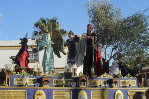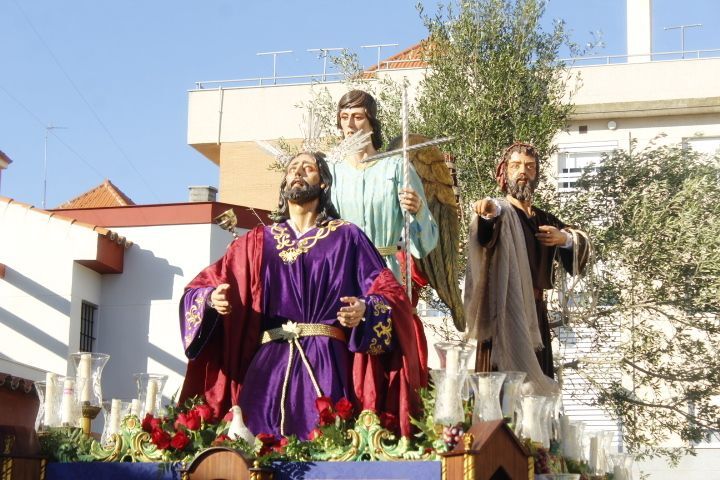Muchos fueron los roteños que salieron a la calle a acompañar a los dos pasos, custodiados por policías nacionales de la Asociación Santo Ángel de Rota, y muchos también los que se sumaron al cortejo en el que se pudo ver una amplia representación de niños y gente joven que respaldan así la labor que hace "Huerto de los Olivos" poniendo a sus titulares en la calle, cada vez más numerosos. Desde luego, y pese a las opiniones diversas que existen en torno al funcionamiento de esta entidad, el paso de Jesús de la Redención llama la atención porque no procesiona ninguno igual en la localidad, con tantas tallas formando el conjunto escultórico. Una escena que representa a Jesús de Nazaret en el momento inicial de su pasión cuando Judas Iscariote lo entrega.