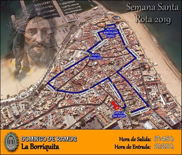Para este Domingo de Ramos, 14 de abril, la previsión de la salida procesional de La Borriquita es a las 17.45 horas y su recogida a las 21.25 horas, con el siguiente itinerario: plaza de San Roque, Aviador Durán, Mina, Prim (dcha), Higuereta (izqda.), Arco de Regla, Fermín Salvochea, Méndez Núñez, plaza Bartolomé Pérez, Plazoleta Padre Eugenio, Pérez de Bedoya, plaza Barroso, Constitución (dcha.), Pozo de la Villa, Álvaro Méndez, plaza de Andalucía, Veracruz, Merino, Isaac Peral, García Sánchez, plaza de San Roque y a su capilla.