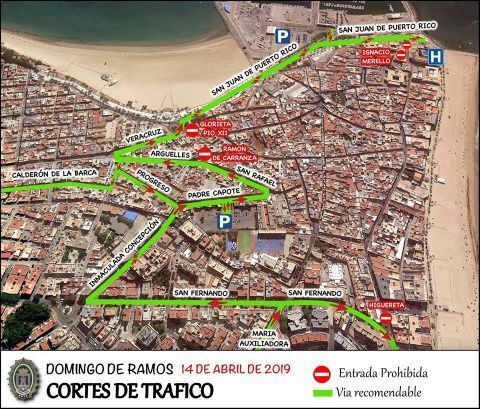 La duración aproximada de los cortes de tráfico con motivo de la procesión de La Borriquita será entre las 15.00 y las 22.30 horas.