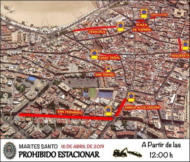 Por lo tanto, estará prohibido estacionar en la calle Veracruz (desde plaza de Andalucía a calle Merino); la calle Higuereta (desde Arco de Regla a calle Prim); calle San Rafael (carga y descarga); en avenida San Fernando desde María Auxiliadora a calle Inmaculada Concepción; calle María Auxiliadora (desde plaza San Roque a avenida San Fernando); y calle Isaac Peral (carga y descarga).