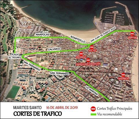 La duración aproximada de los cortes de tráfico con motivo de la procesión del Martes Santo será entre las 19.30 horas y las 03.00 horas.