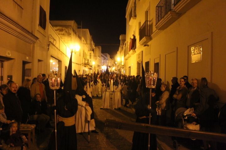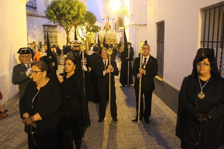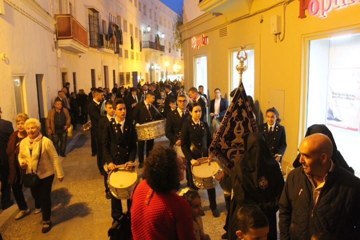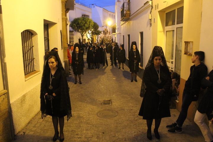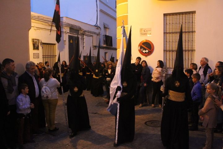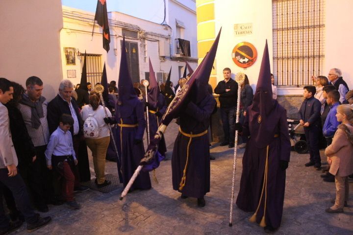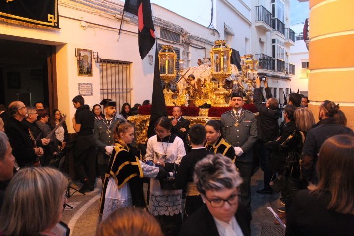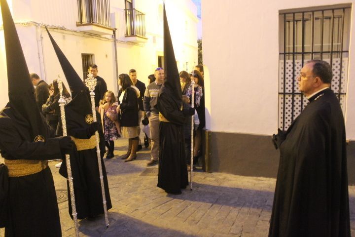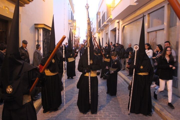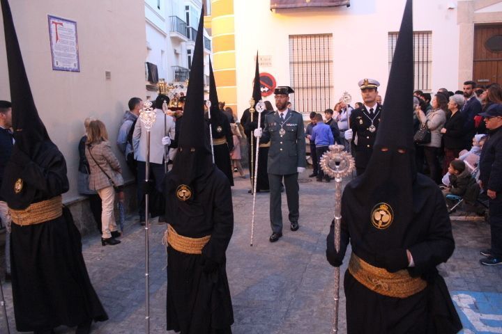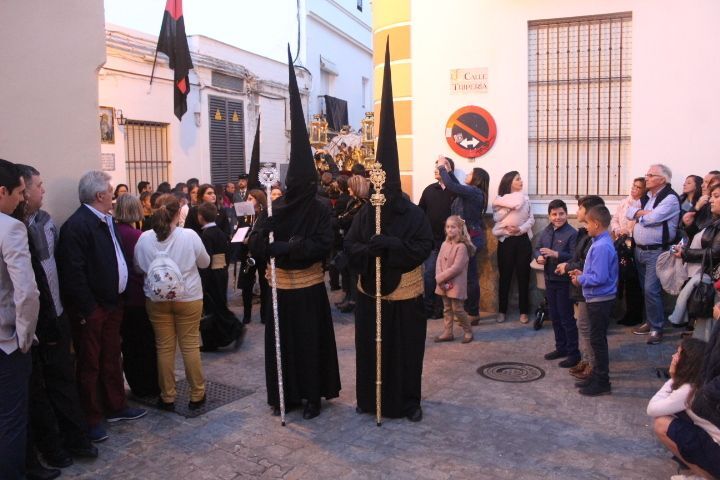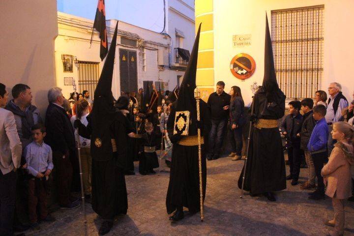 Quince minutos retrasó esta hermandad su salida para asegurarse de que no llovería como los partes meteorológicos indicaban, y finalmente, el pronóstico se cumplió y el Cristo Yacente y la Soledad pasearon por las calles de la villa luciendo espléndidas. Dos imágenes que estuvieron arropadas por unos 200 hermanos formando un cortejo que abría la Cruz de Guía junto al muñidor, personaje que se rescató hace unos años y que representa a ese criado de una cofradía encargado de convocar a los cofrades a los actos y ceremonias religiosas. El tintineo de su campana anunciaba que próximos estaban Jesús y su madre, que estuvieron arropados en todo momento por mucho público por las calles. Y es que este Viernes Santo, tras el mal sabor de boca del Jueves Santo que se quedó a medias, había ganas de pasos y procesiones y en concreto es este día el único de la Semana Santa de Rota en el que coinciden dos cofradías en la calle.