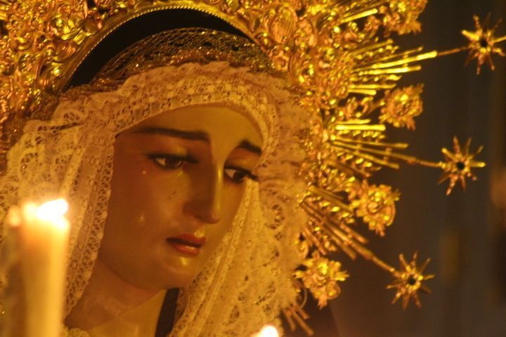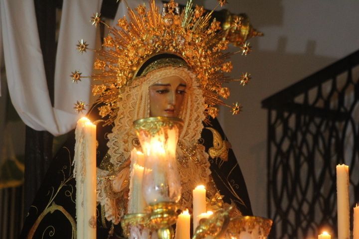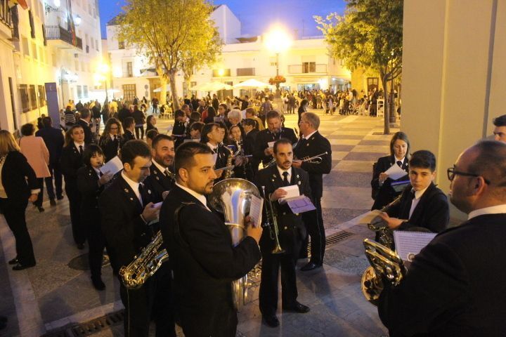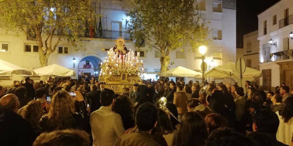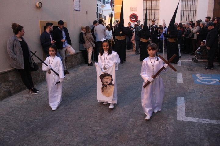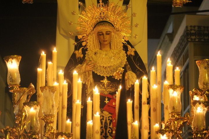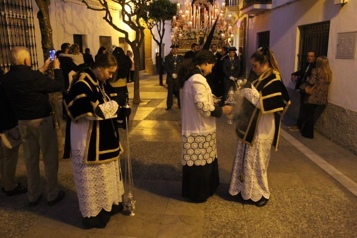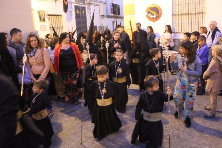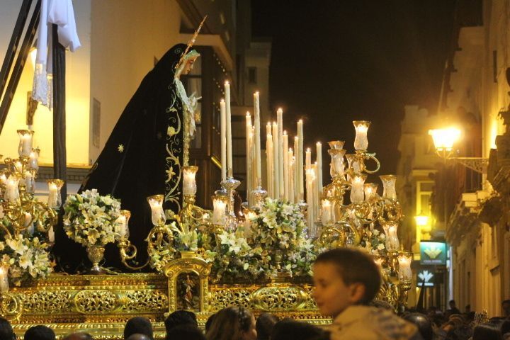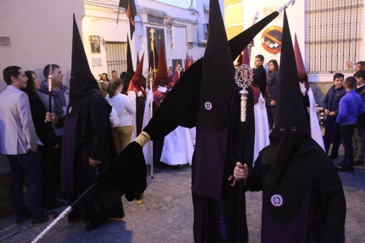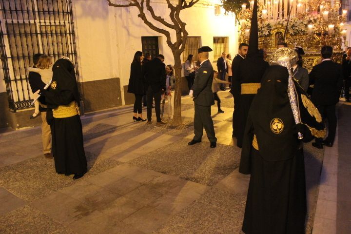 Quince minutos retrasó esta hermandad su salida para asegurarse de que no llovería como los partes meteorológicos indicaban, y finalmente, el pronóstico se cumplió y el Cristo Yacente y la Soledad pasearon por las calles de la villa luciendo espléndidas. Dos imágenes que estuvieron arropadas por unos 200 hermanos formando un cortejo que abría la Cruz de Guía junto al muñidor, personaje que se rescató hace unos años y que representa a ese criado de una cofradía encargado de convocar a los cofrades a los actos y ceremonias religiosas. El tintineo de su campana anunciaba que próximos estaban Jesús y su madre, que estuvieron arropados en todo momento por mucho público por las calles. Y es que este Viernes Santo, tras el mal sabor de boca del Jueves Santo que se quedó a medias, había ganas de pasos y procesiones y en concreto es este día el único de la Semana Santa de Rota en el que coinciden dos cofradías en la calle.