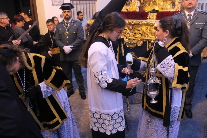 La Hermandad del Santo Entierro que este año estrenaba la sábana y diseño del catafalco, los dos llamadores de ángeles y el tocado y puñetas de estilo victoriano de la virgen, ha contado un año más con la escolta de miembros de la Guardia Civil, cuerpo que es hermano honorario de esta hermandad.